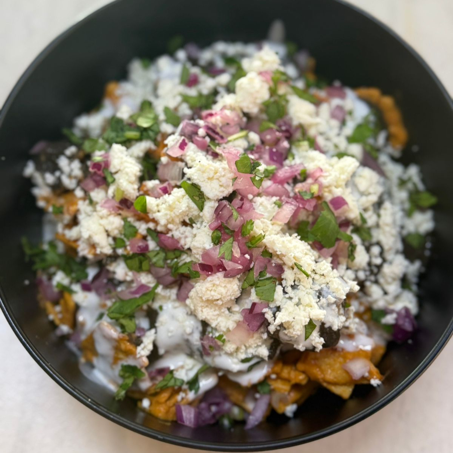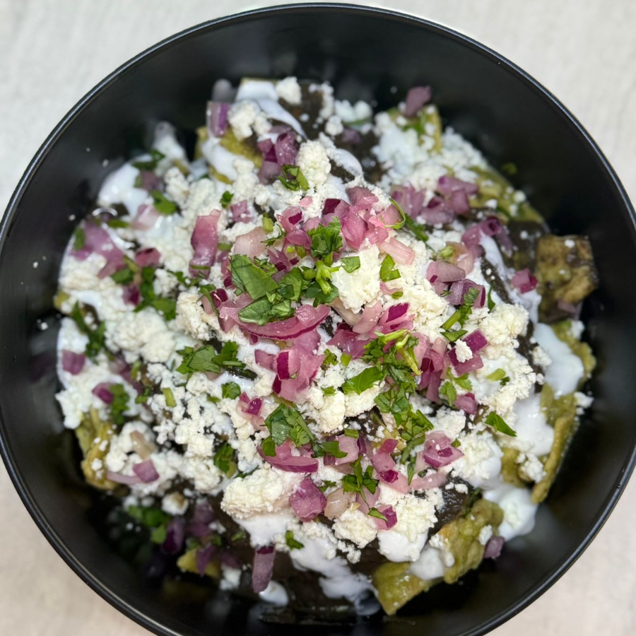 Deliciosos chilaquiles, con totopos (65gr) , tu salsa favorita (4oz), frijoles (1oz), queso doble crema, cebolla morada, crema y cilantro fresco. puedes elegir el picor que gustes.