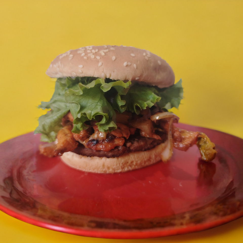 Carne de res, queso amarillo, jamón, tocino, tomate, lechuga, mostaza y chile en raja