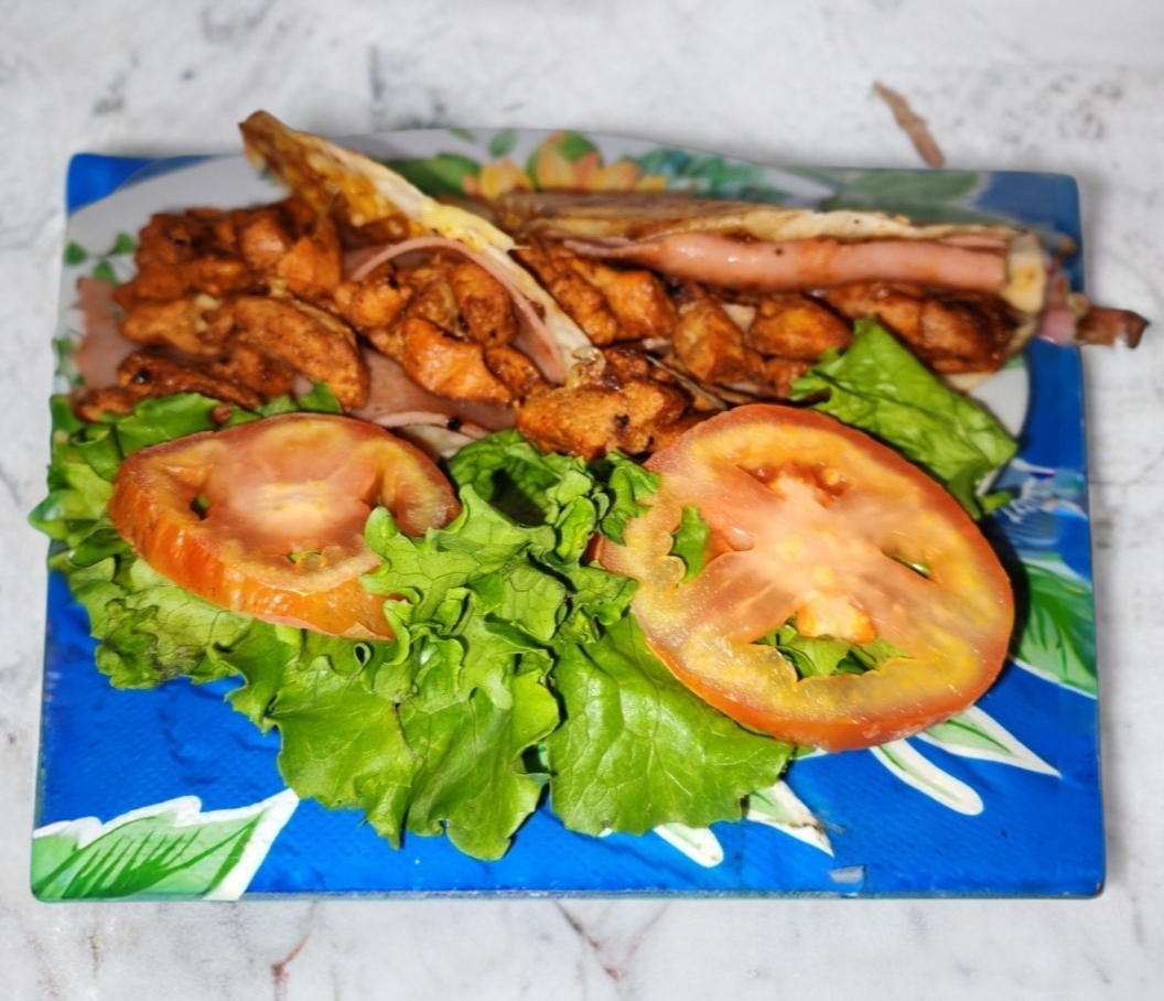 Tortilla de harina, queso gratinado, jamón y carne de res