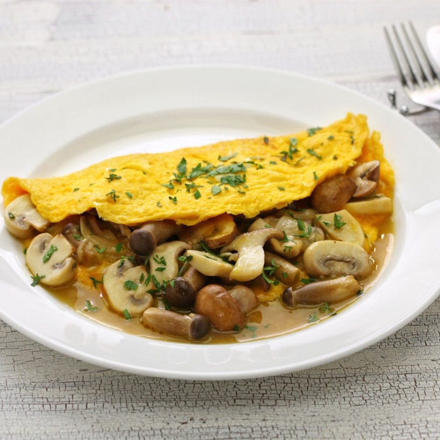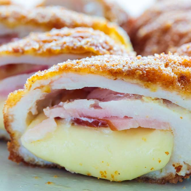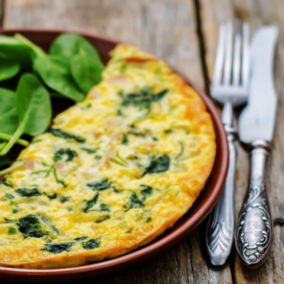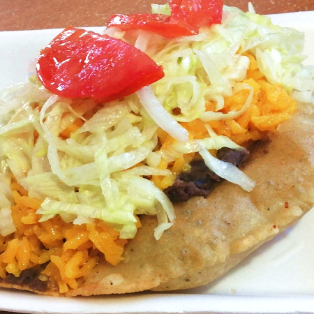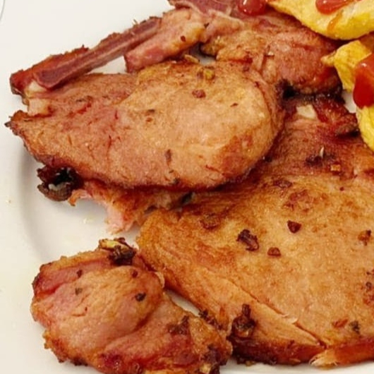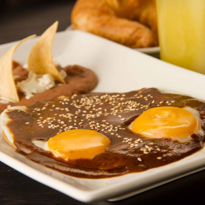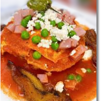 Tres huevos estrellados entre tostadas de maíz y frijoles refritos, cubiertos con salsa de jitomate, longaniza enjamonada, tocino y cubos de jamón; acompañados de plátanos fritos