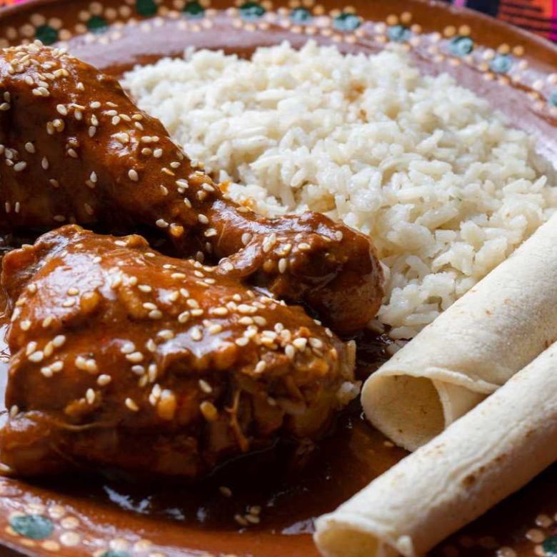 1litro de 2 piezas pollo en mole con arroz y tortillas