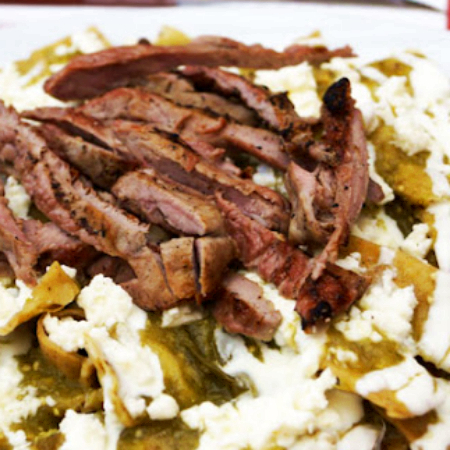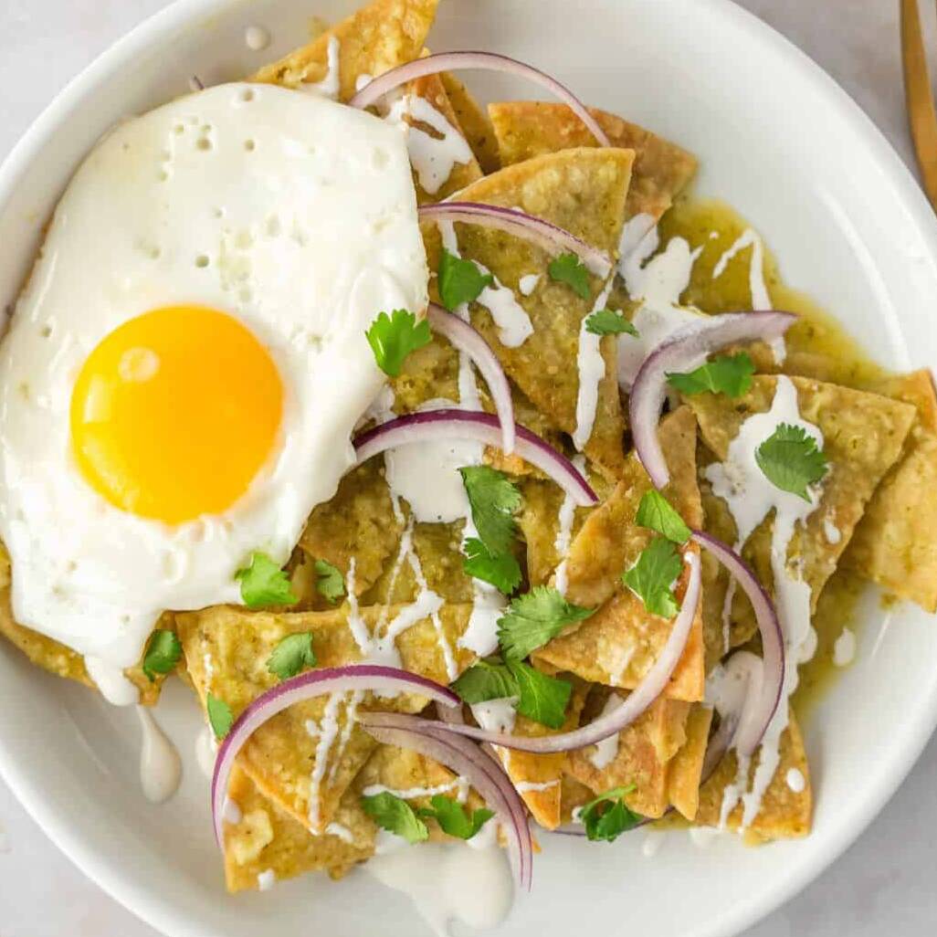 Chilaquiles de pollo con huevo termino cocido bañadas en salsa verde