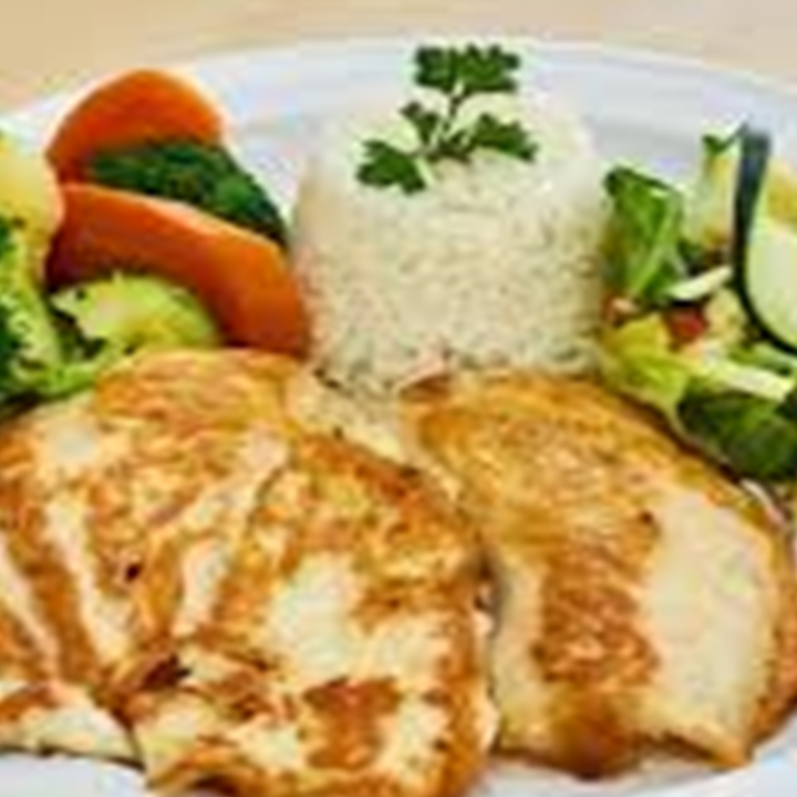 pechuga de pollo empanizada con arroz, frijolitos arroz y platanito