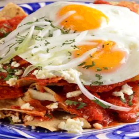 chilaquiles de pollo con huevo termino cocido de salsa roja