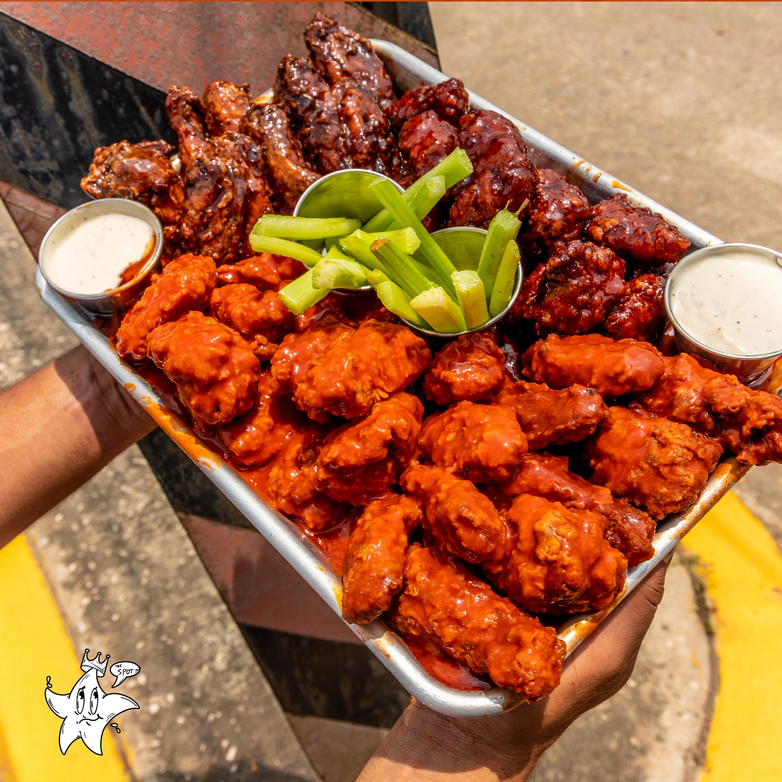 30 Deliciosas alitas, acompañadas de papitas a la francesa, aderezo ranch, bastones de apio y zanahoria.