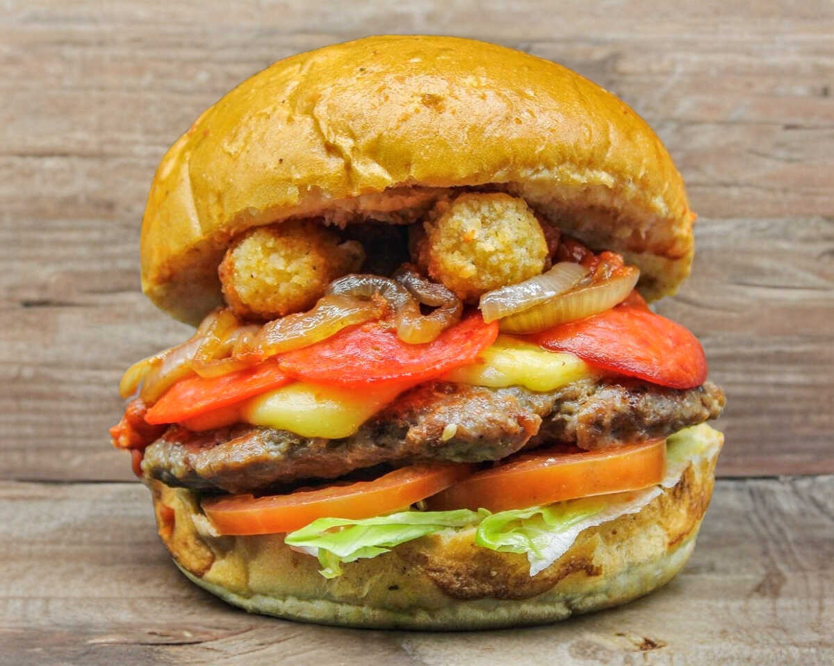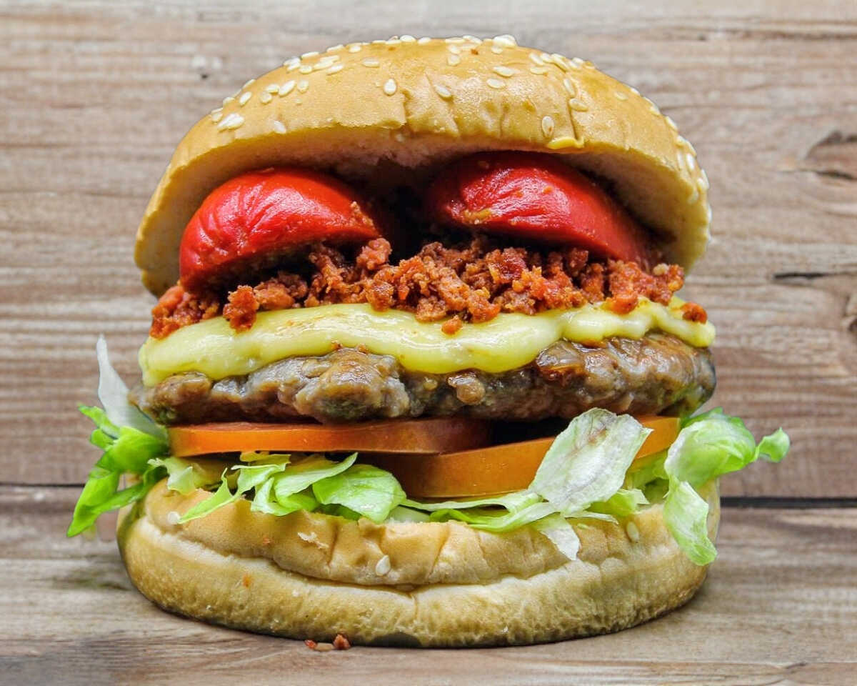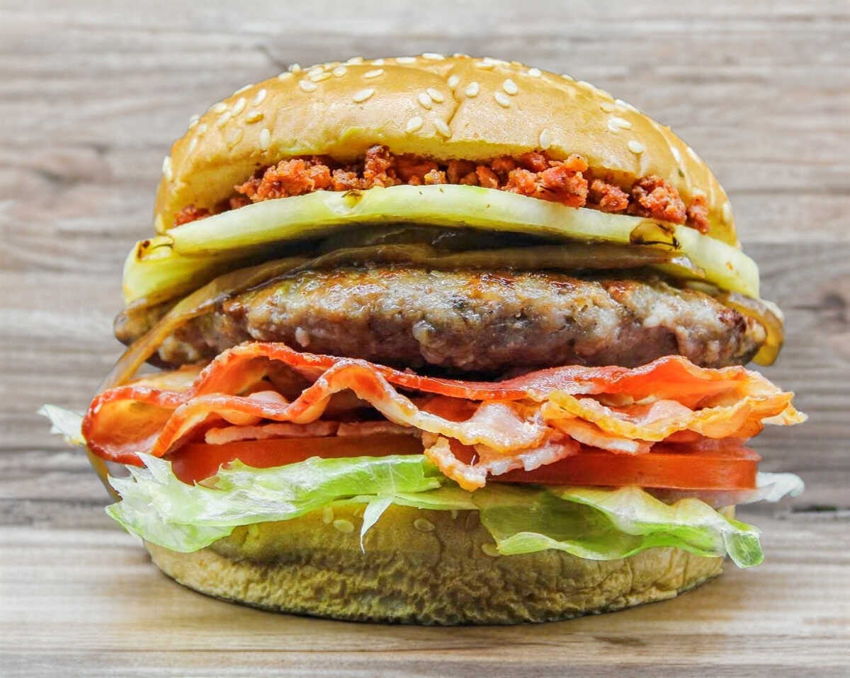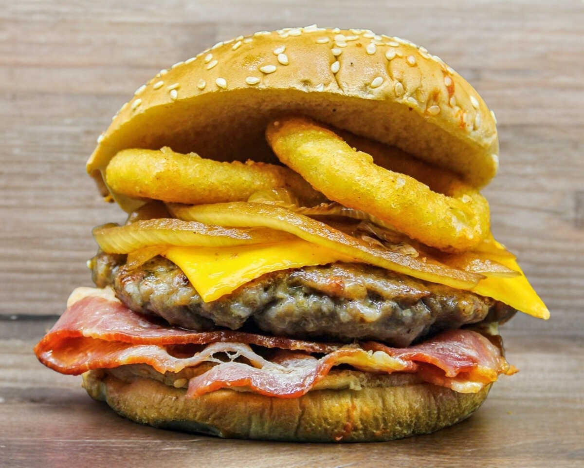 2 carnes, queso americano, tocino, pepinillos y cebolla caramelizada.