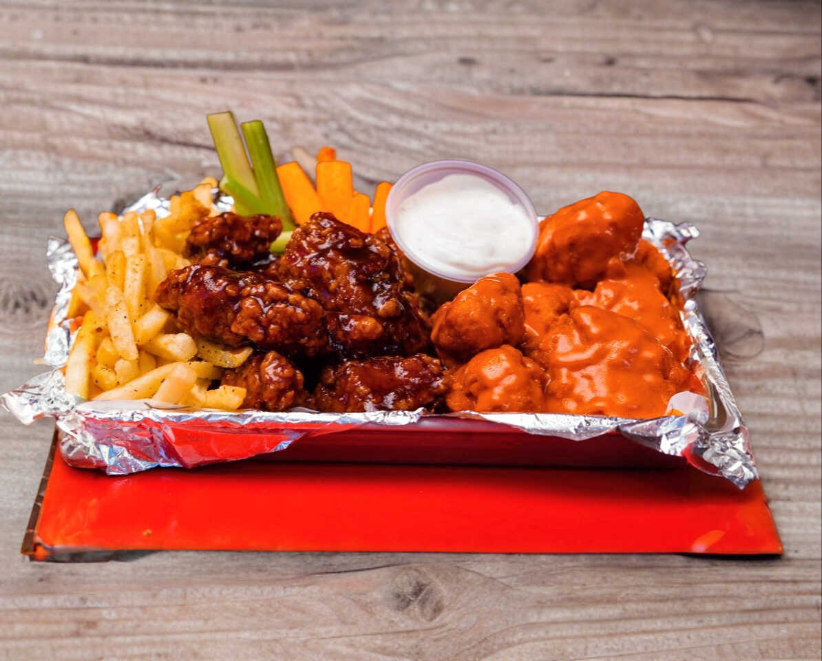 400g de nuestros deliciosos boneless bañados en la salsa de tu preferencia acompañados de aderezo ranch, apio, zanahoria y nuestras exquisitas papas a la francesa.