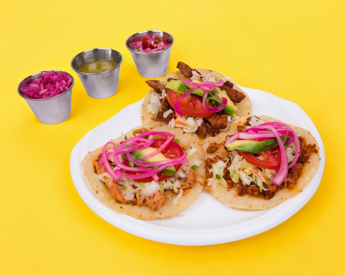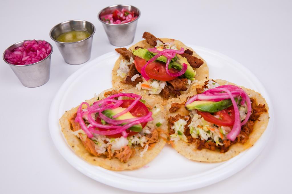 Salbute de papa con chorizo de pavo, se acompaña con repollo, tomate, cebolla y aguacate.