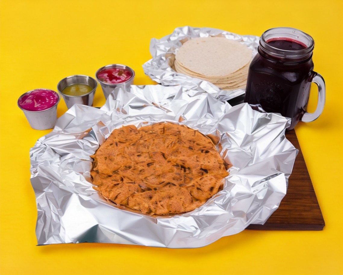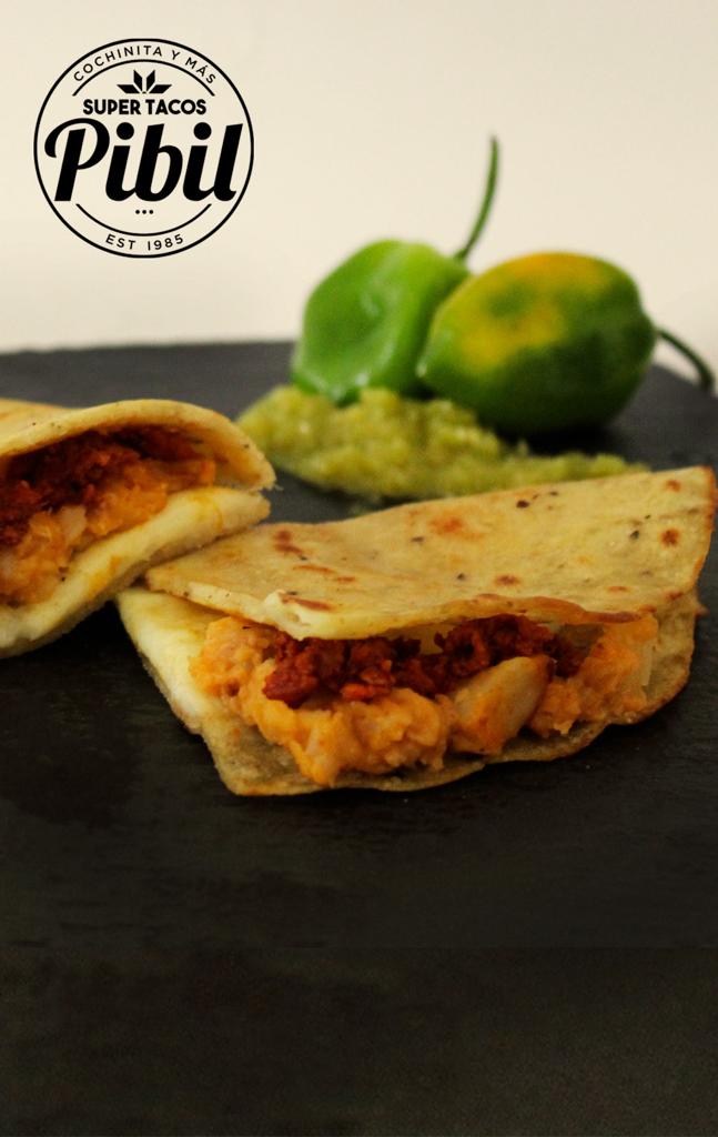 Quesadilla de cochinita pibil con carne surtida y cuerito mezclado (tortilla hecha a mano con 50 gramos de carne y 50 gramos de queso).