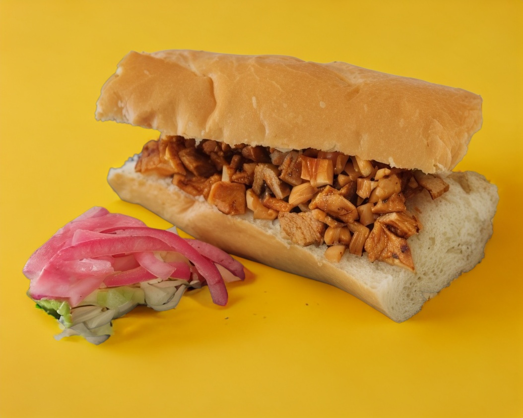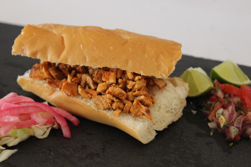 Baguette de cochinita pibil con carne surtida y cuerito mezclado.