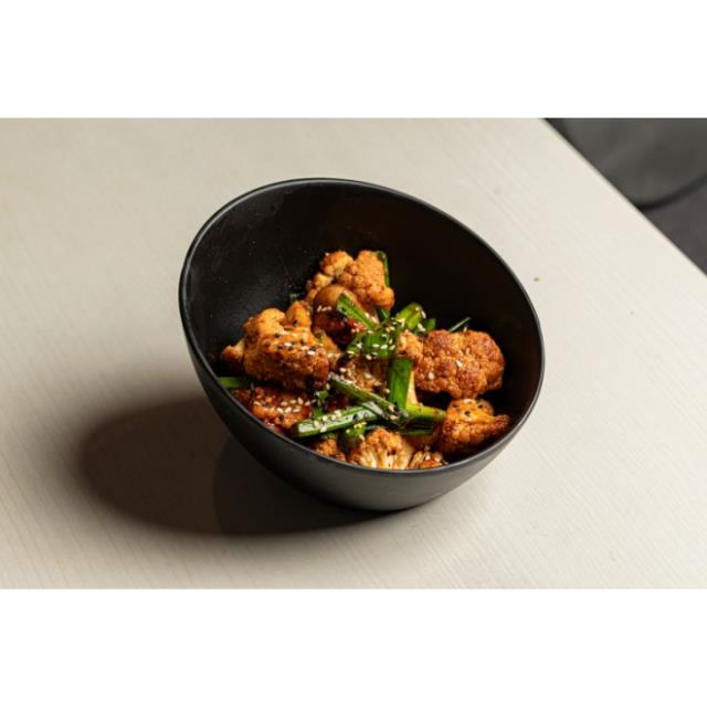 Deliciosa Coliflor Salteada, con tocino, tallo de cebolla cambray, salsa de la casa y salsa gochujang.