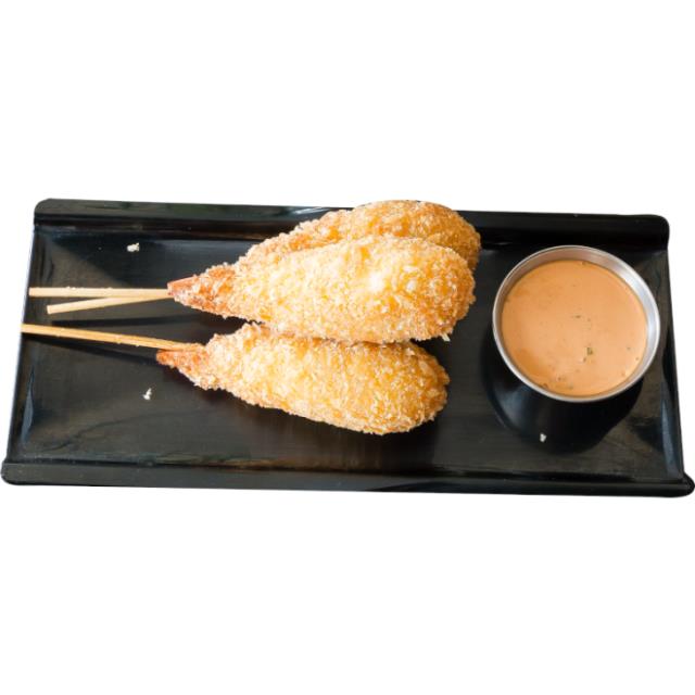 Brocheta japonesa de camarón y queso empanizada en hojuelas de panko.
