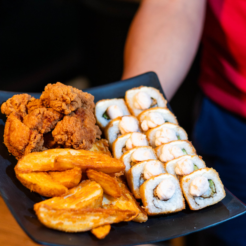 sushi pinta maki, pechuga teriyaki, arroz yakimeshi