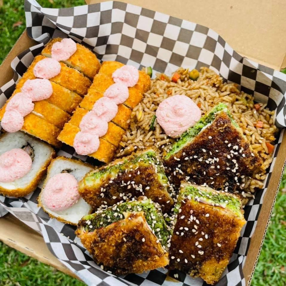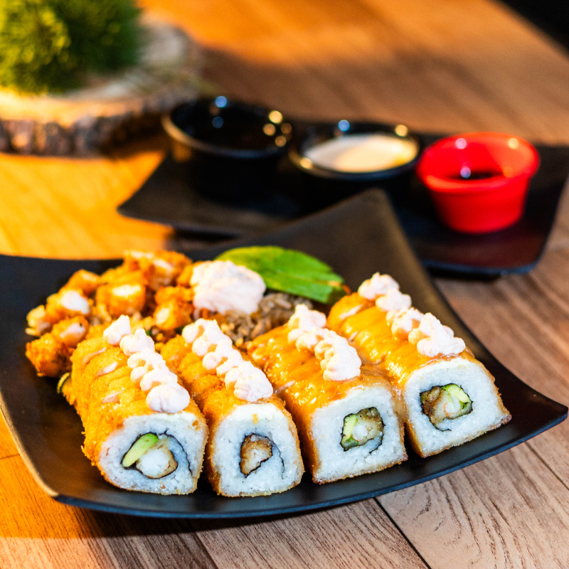 Sushis pinta Maki empanizado con arroz yakimeshi aguacate y Tampico.