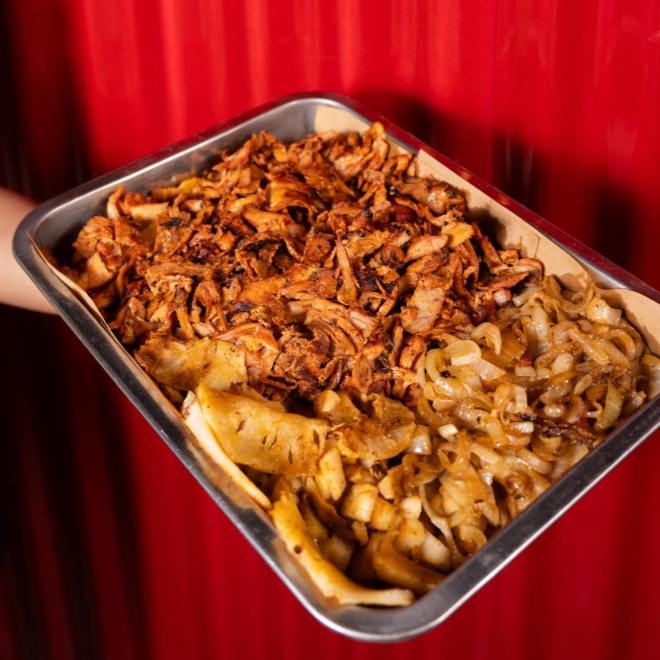Nuestra ya tradicional receta de Pastor, acompañada de cebolla y cilantro, salsa verde, limones, tortilla. la carne se pesa precocida.