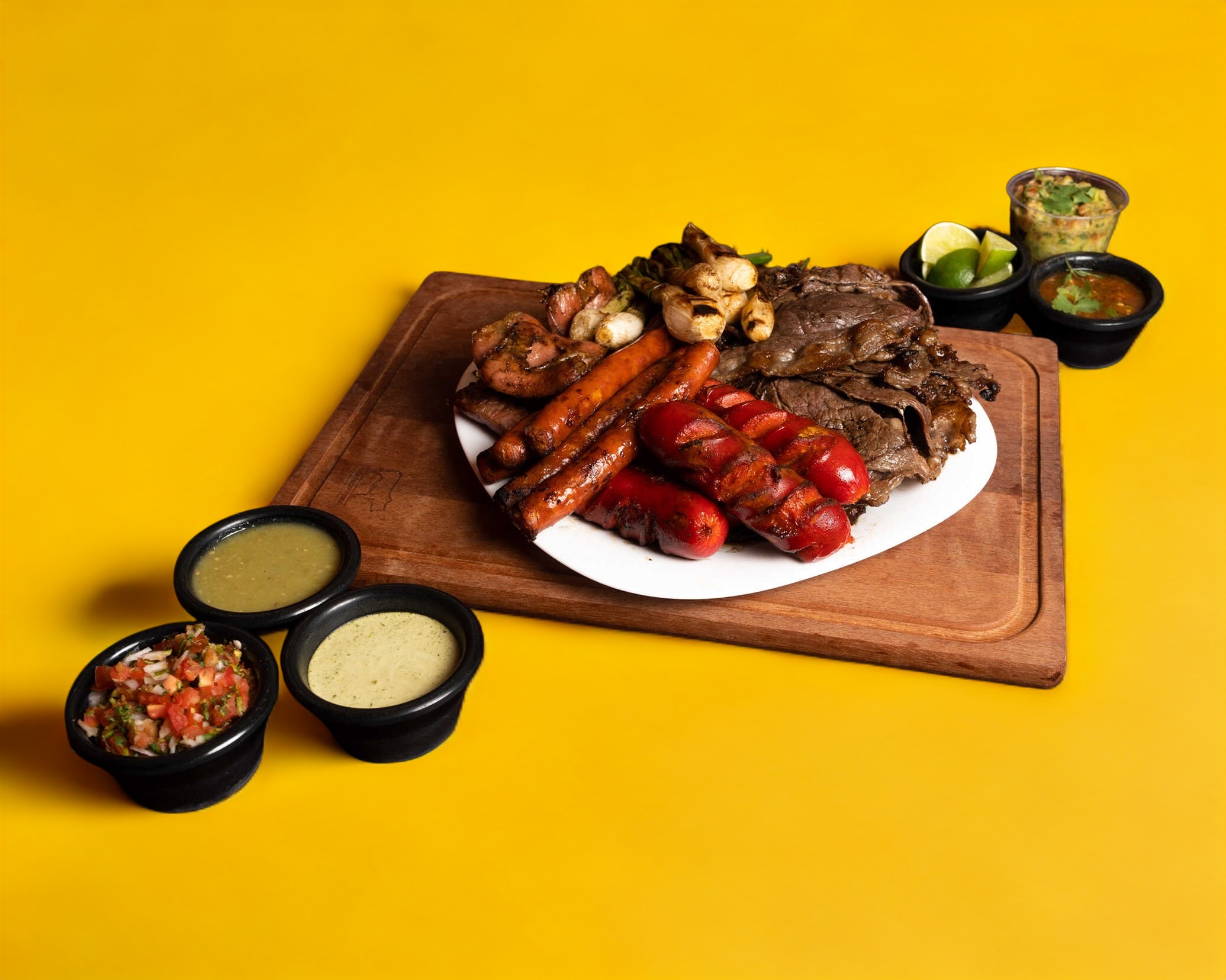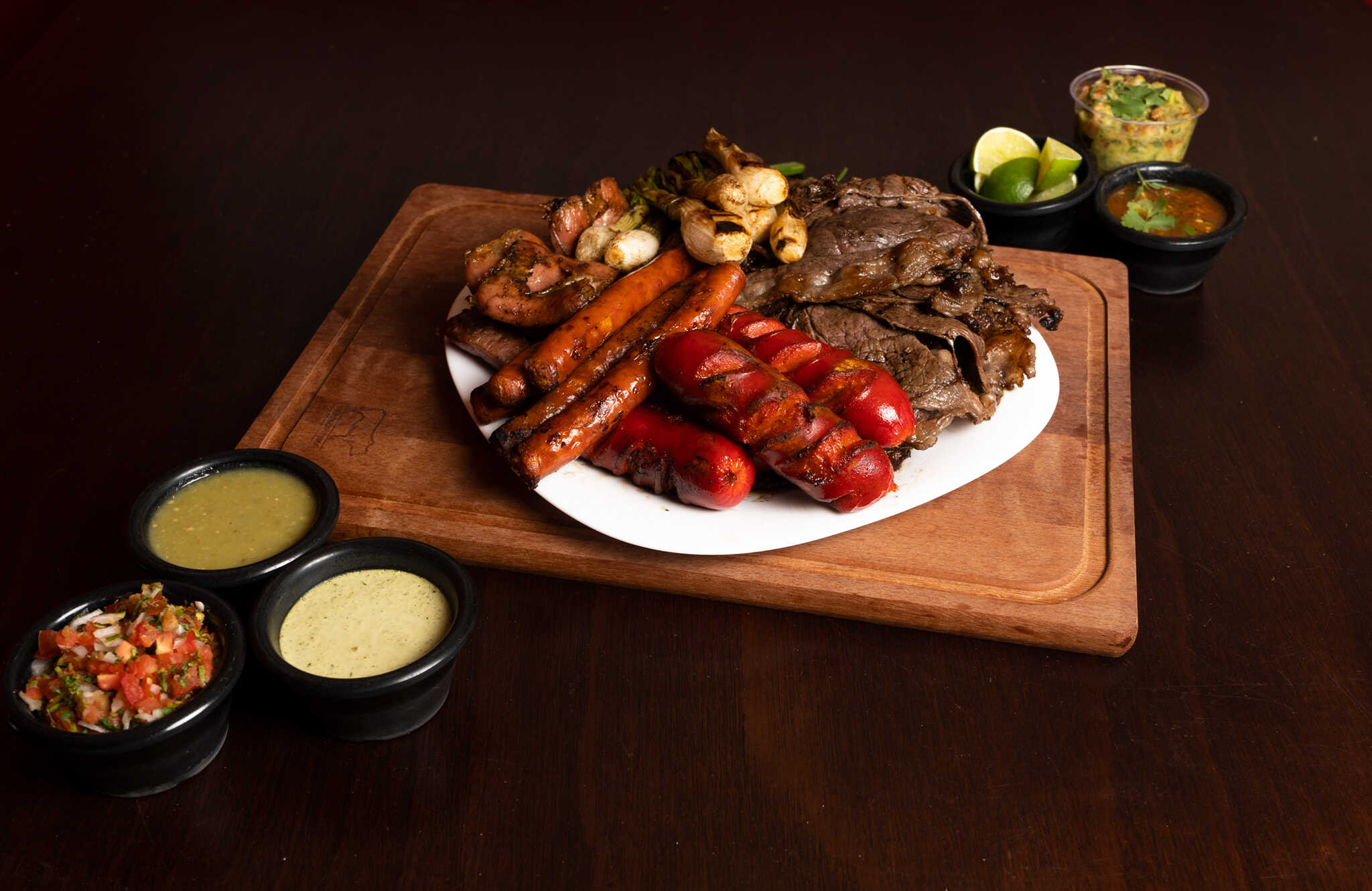 Con 125 gramos de chistorra, 125 gramos de chorizo argentino, 2 salchichas alemanas, 125 gramos de cebollas cambray, salsas y tortillas.