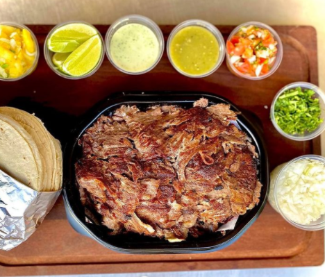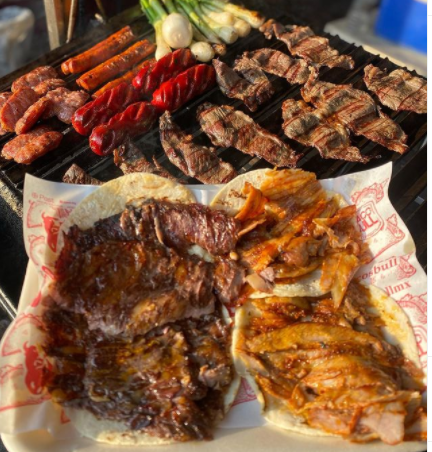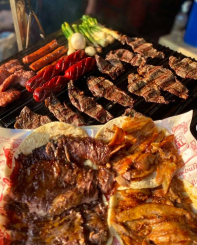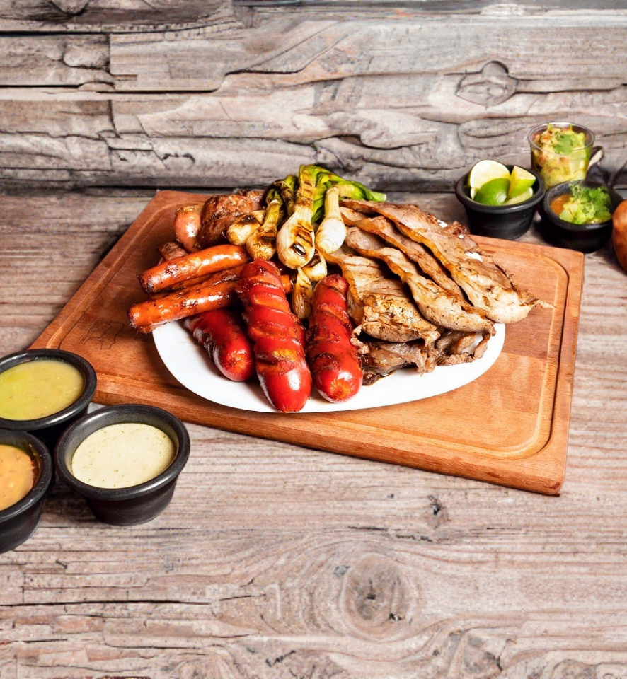 500 GRAMOS DE ASADA AL CARBÓN, ACOMPAÑADO DE 125 GRS DE CHISTORRA, 125 GRS DE CHORIZO ARGENTINO, 2 SALCHICHAS ALEMANAS, 125 GRS DE CEBOLLAS CAMBRAY, SALSA MEXICANA, SALSA VERDE, SALSA TATEMADA Y TORTILLAS