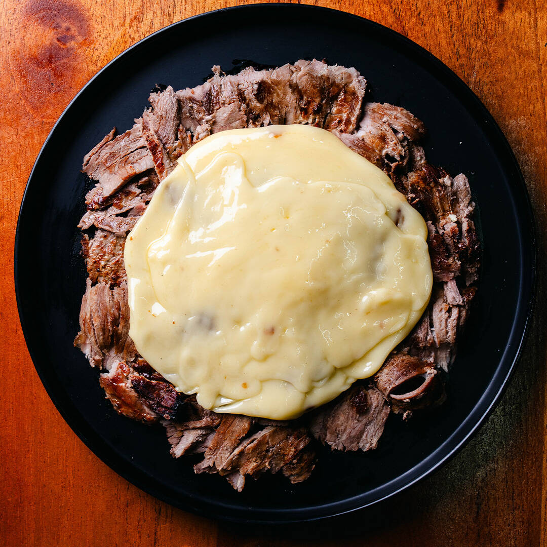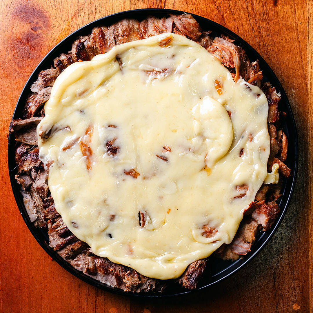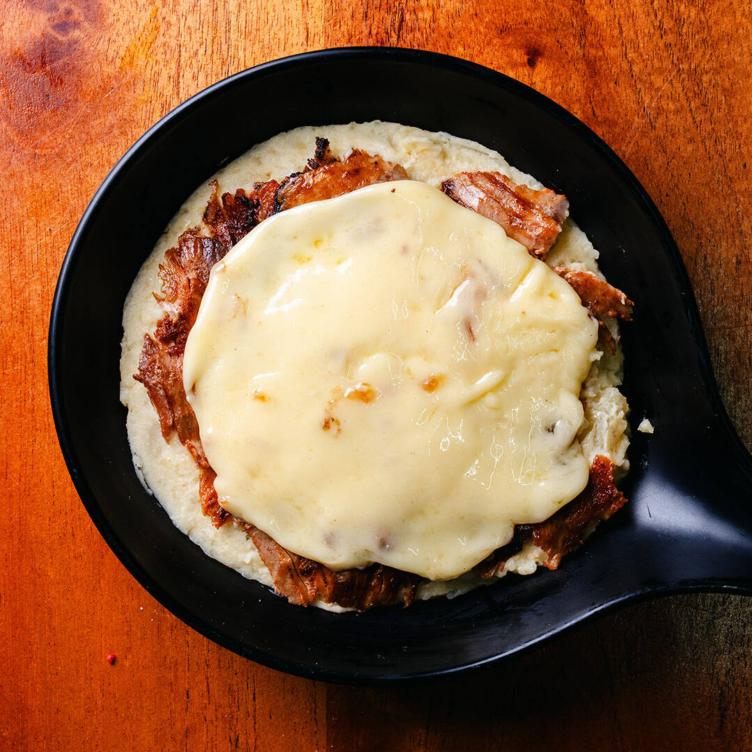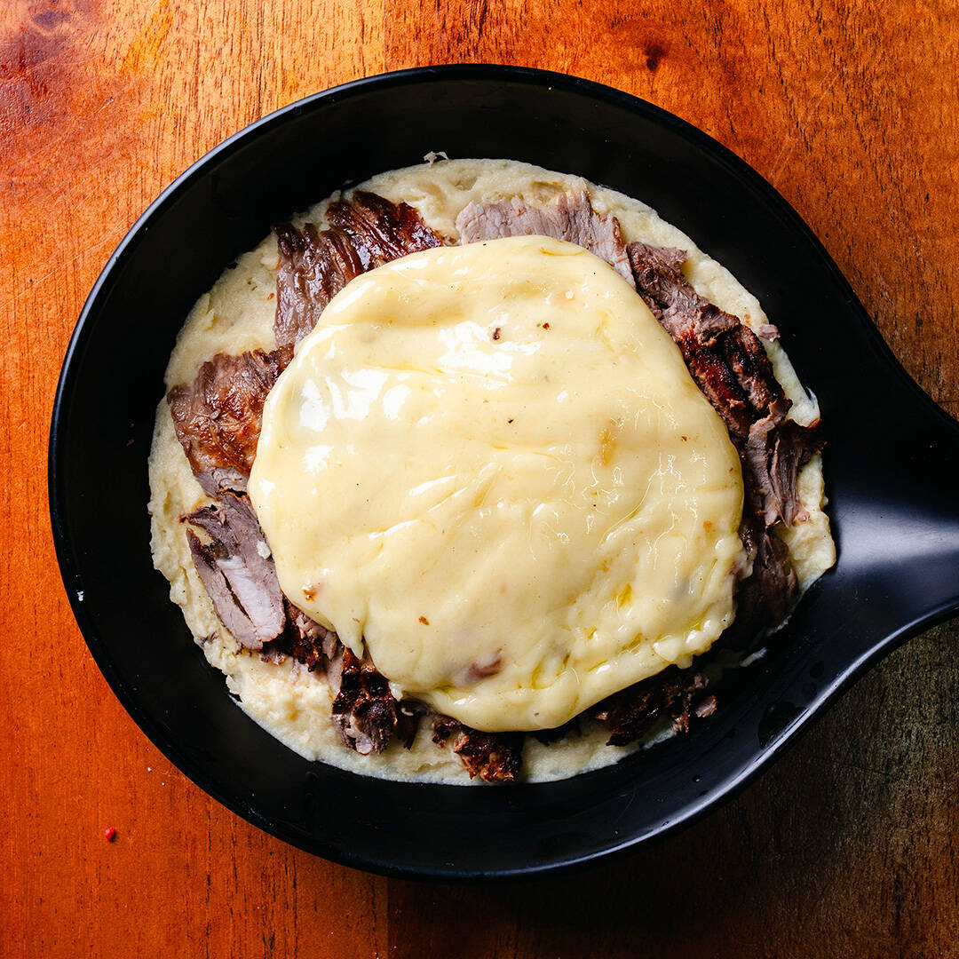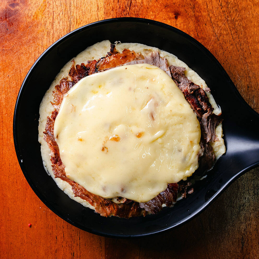 una cama de 220g de puré de papa montado con 200g de carne de sirloin con 100g de queso. Incluye 10pz tortillas