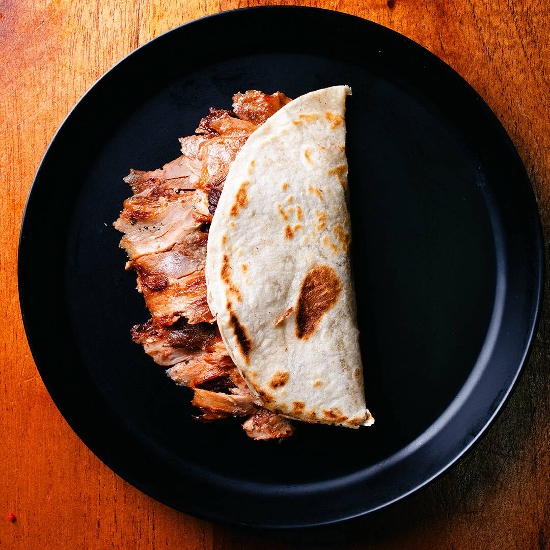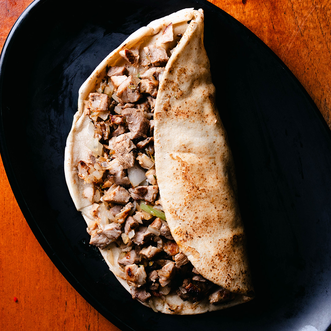 Tortilla de pan pita con 150g carne de chuleta con cebolla acitronada y cilantro