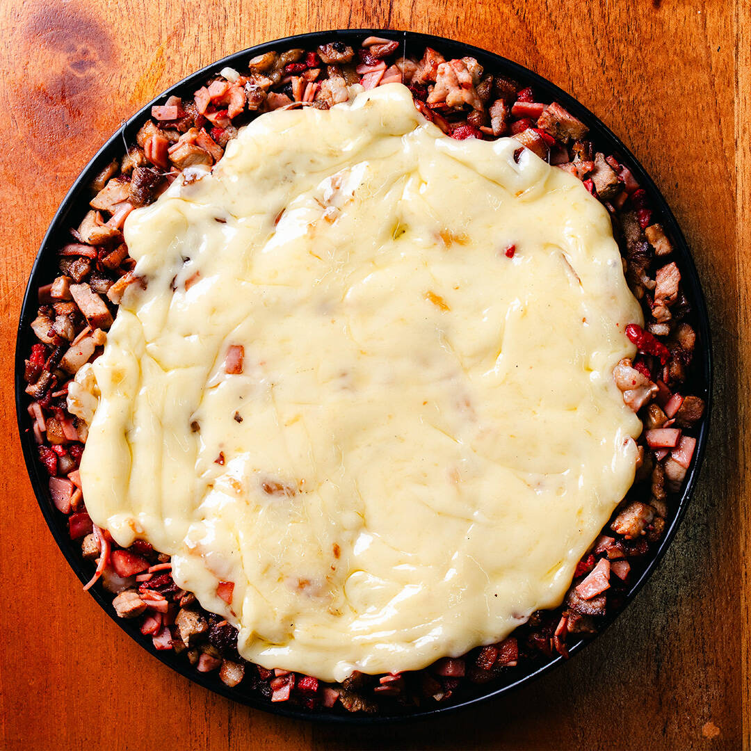 una cama de 220g de puré de papa montado con 200g de carne de chuleta con 100g de queso. Incluye 10pz tortillas