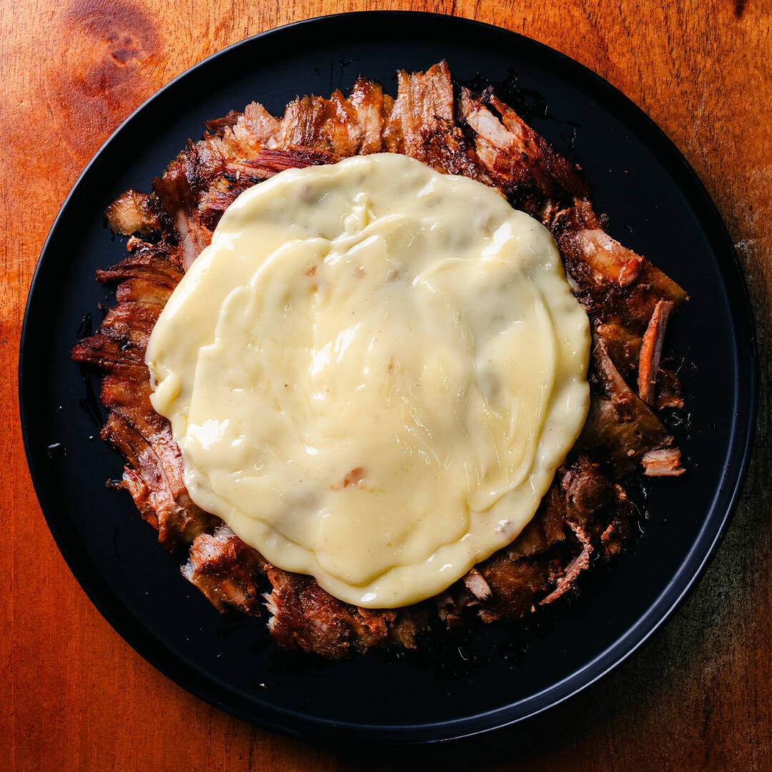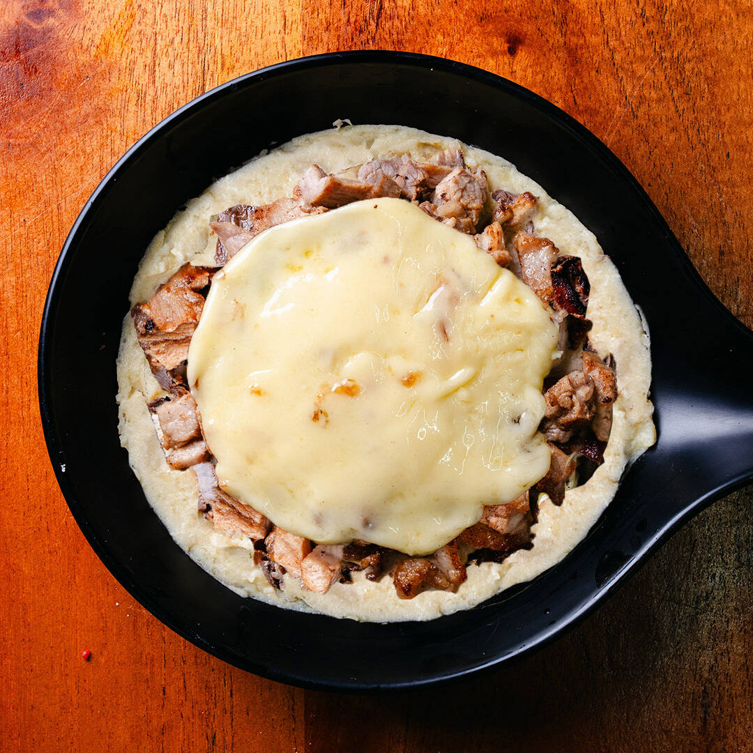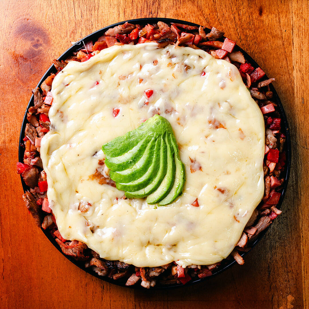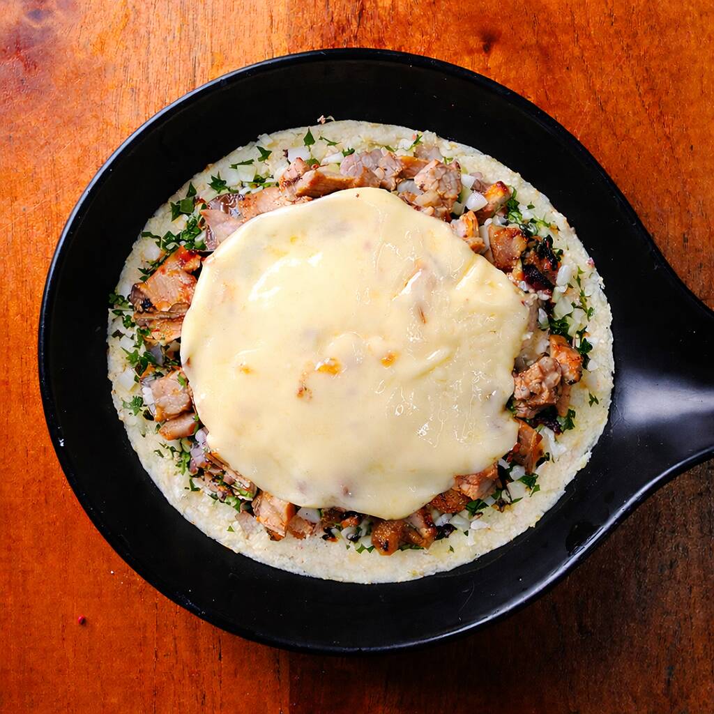 una cama de 220g de puré de papa montado con 200g de carne de pastor y sirloin con 100g de queso. Incluye 10pz tortillas