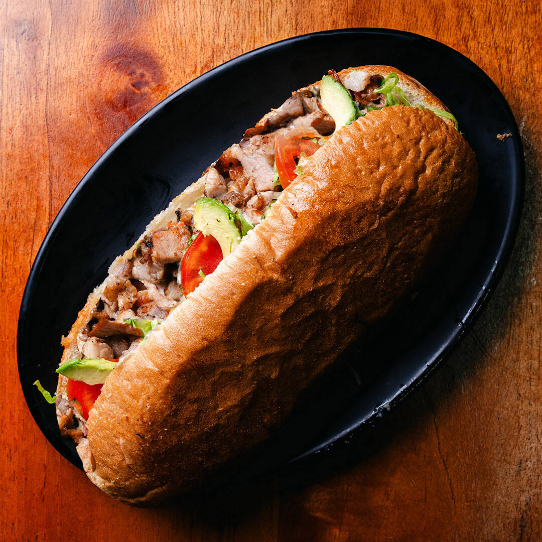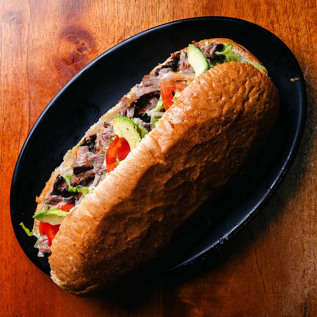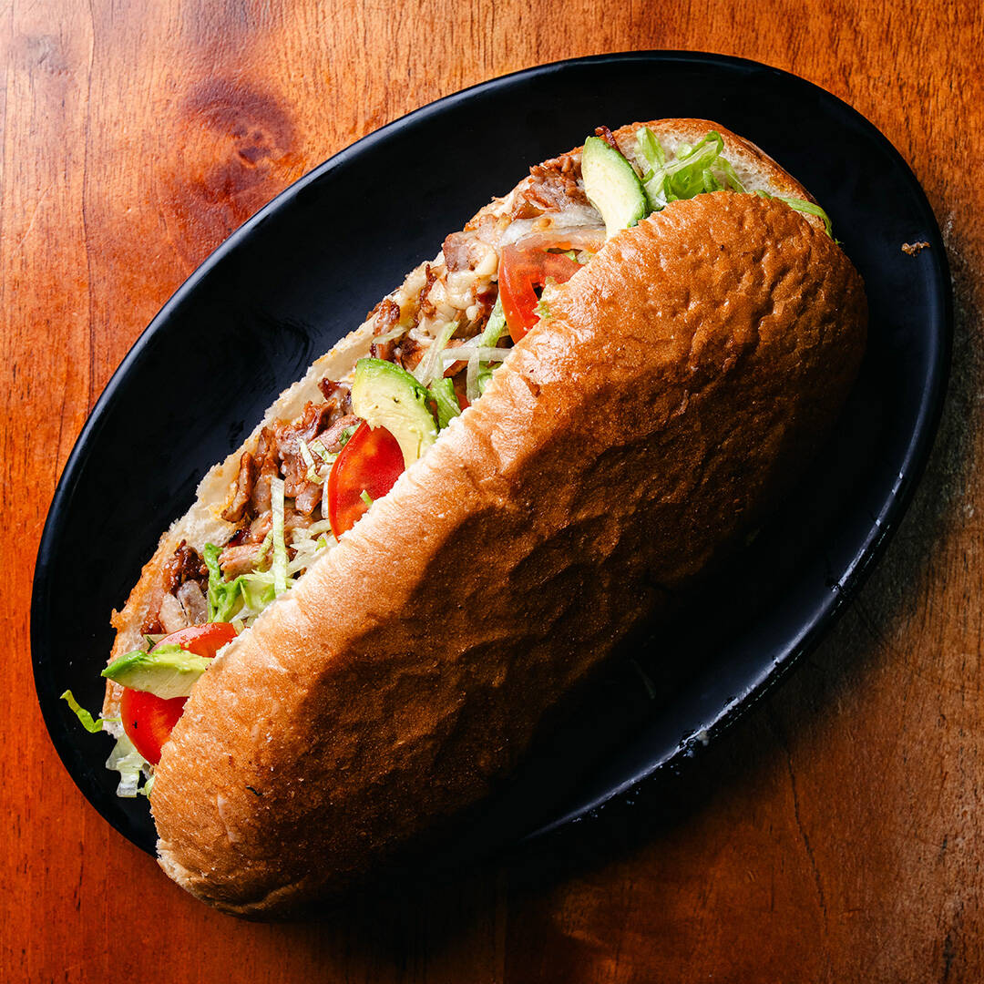 Torta bien servida con pan de telera con mayonesa, lechuga, tomate, aguacate carne de asada, jamón, longaniza y queso