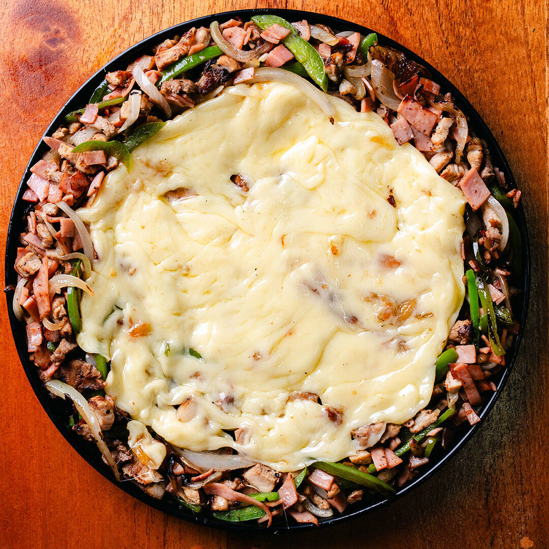 1,200g de pastor, sirloin, asada, chuleta, jamón, chile morrón, longaniza, salchicha roja, cebolla y queso. Incluye 10pz tortillas