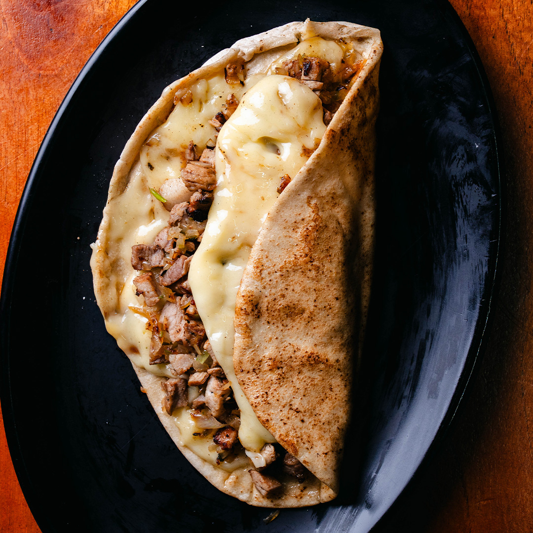 Tortilla de pan pita con 150g carne de chuleta con cebolla acitronada con cilantro y 100g de queso