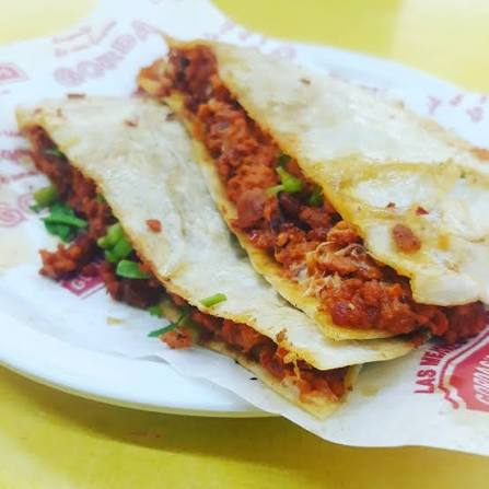 Longaniza asada, tortillina, queso de hebra, lechuga y sus respectivas salsas