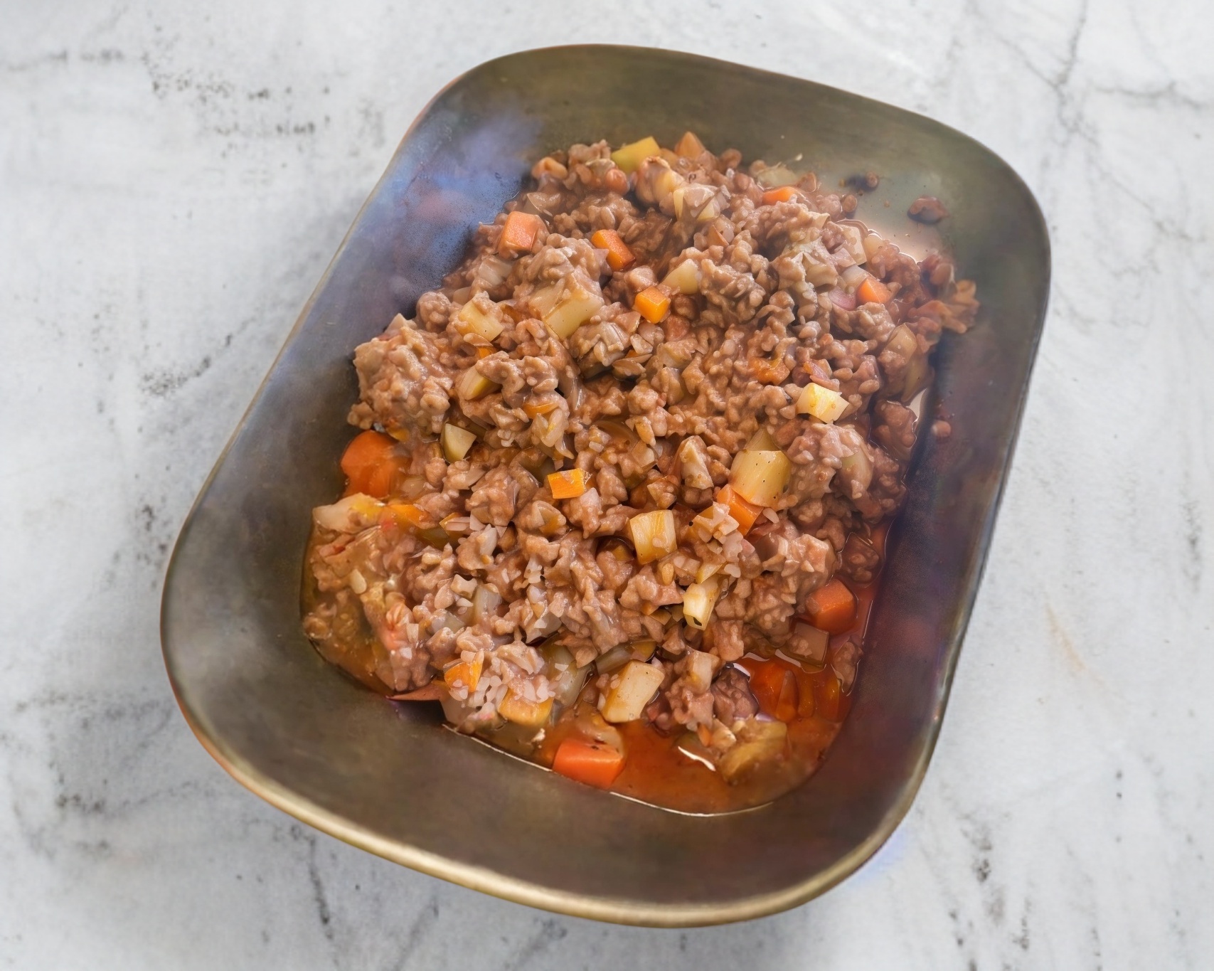 Carne molida de res con papa y zanahoria acompañado con arroz.