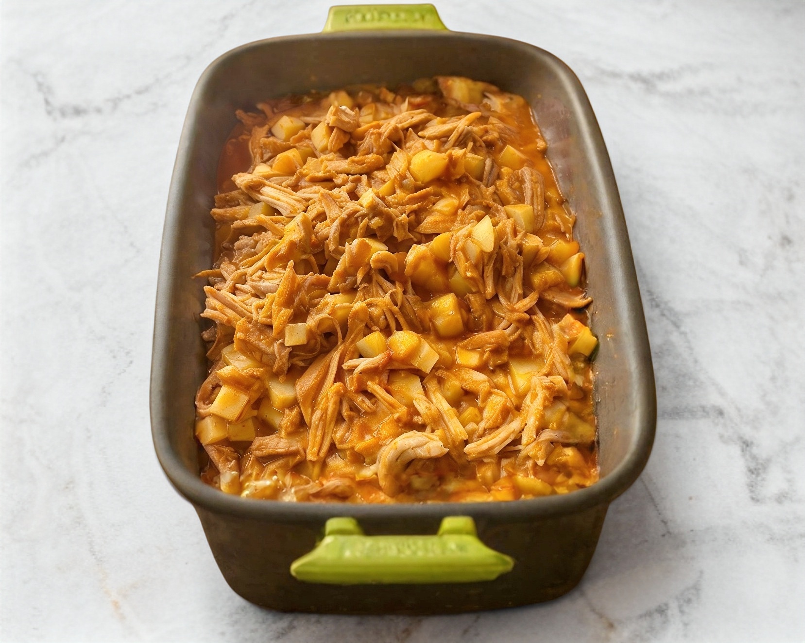 Pollo en raja a la crema con chile poblano y cebolla, acompañado con arroz.