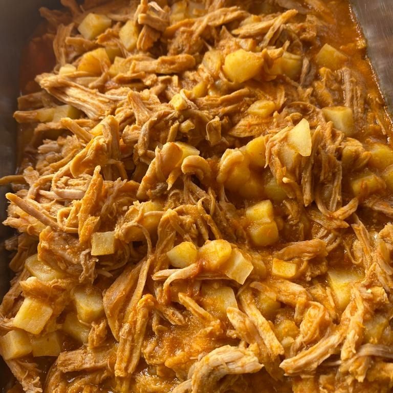 Pierna de cerdo con papa y arroz acompañado con mayonesa.