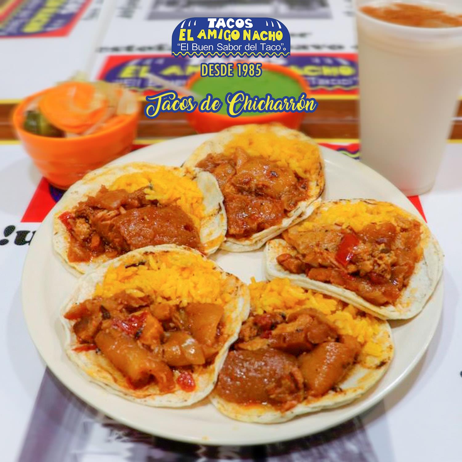 Taco de chicharrón de cerdo, acompañado de salsas.