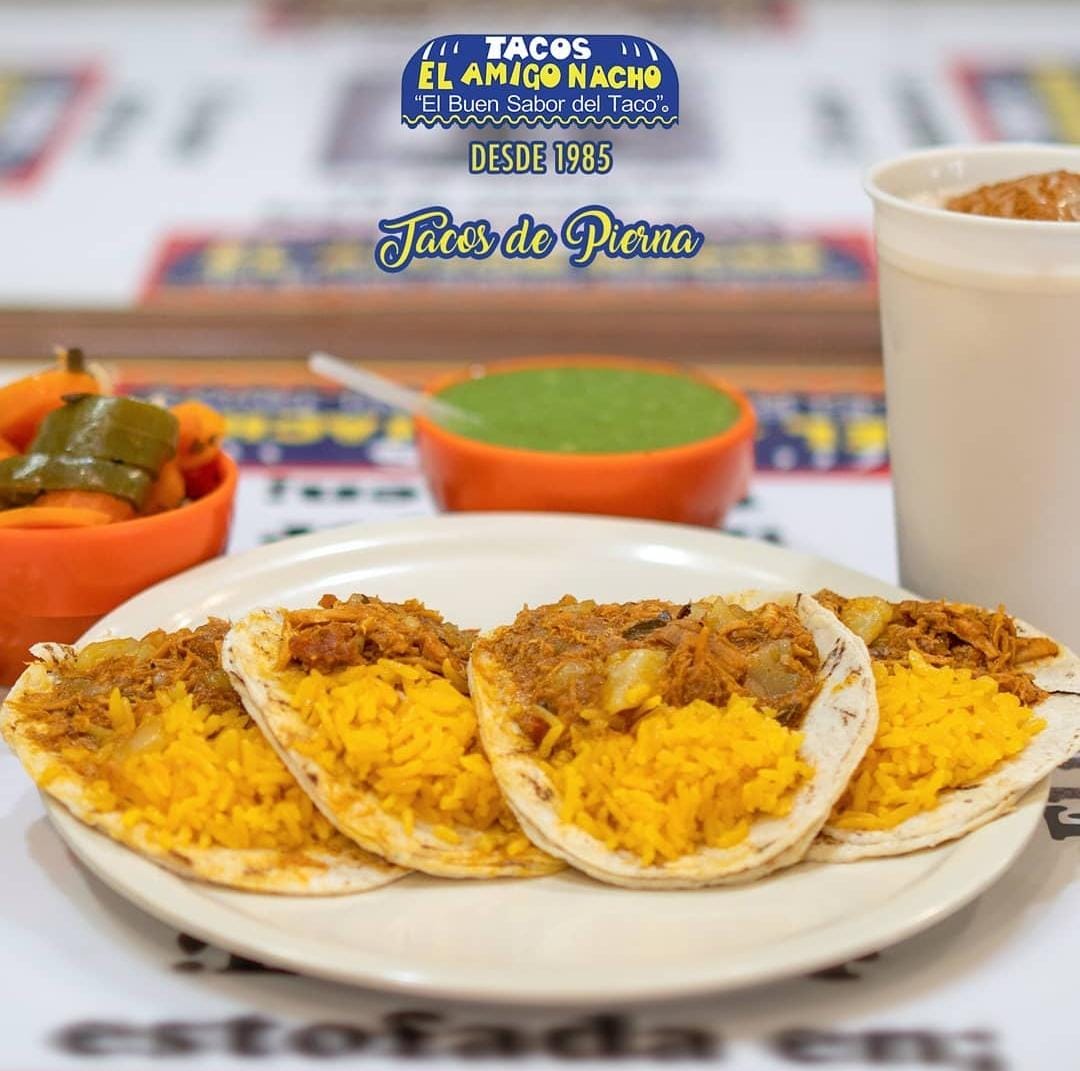 Taco de pierna de cerdo, acompañado de arroz y salsas.