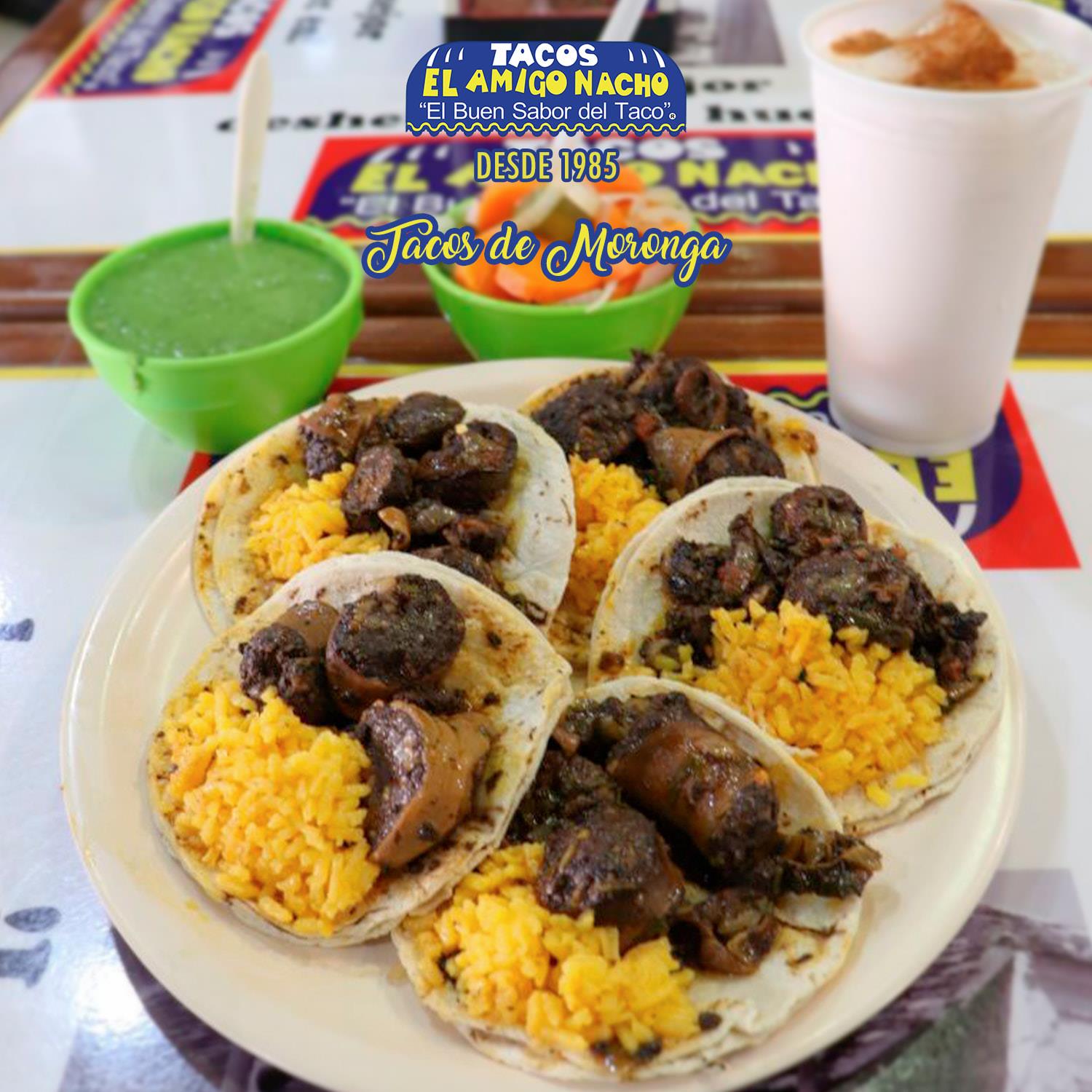 Taco de pancita de cerdo, acompañado de arroz y salsas.