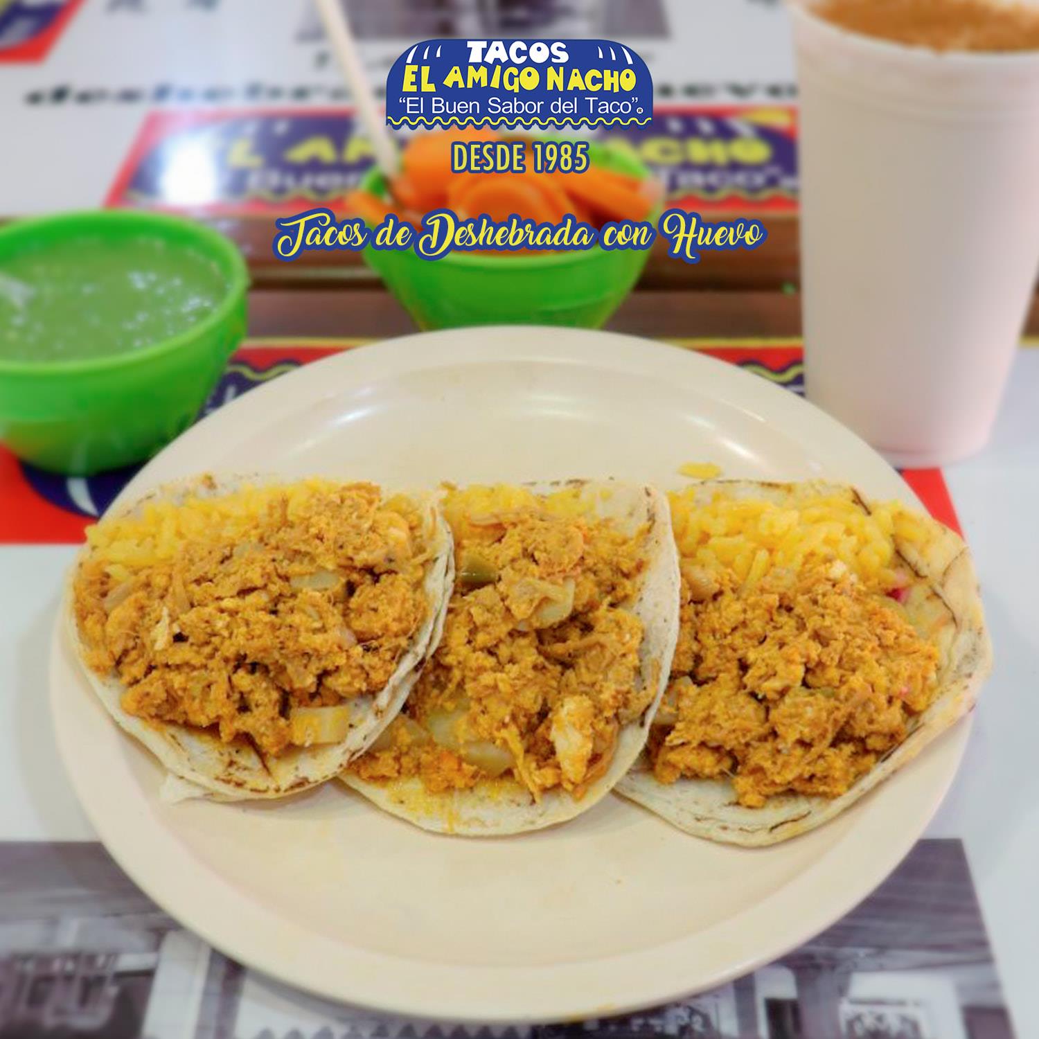 TACO DE CARNE DESHEBRADA DE RES CON HUEVO, ACOMPAÑADO DE ARROZ Y SALSAS