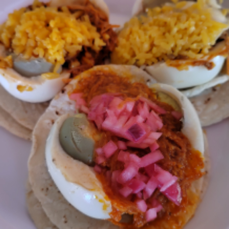 TACO DE HUEVO DURO, ACOMPAÑADO DE CUALQUIER GUISO, ARROZ Y SALSAS