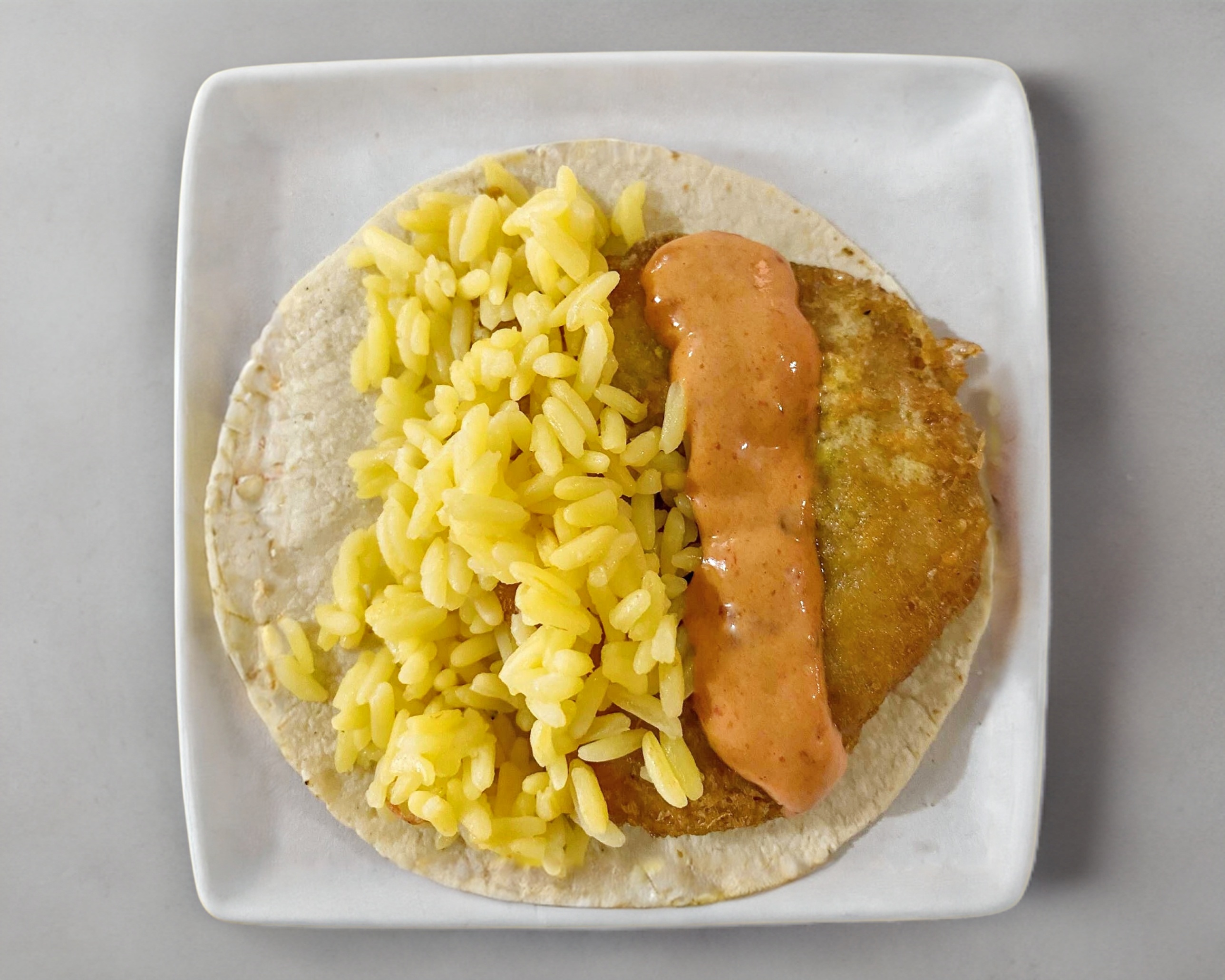 Tortilla de maíz y arroz amarillo. Aderezo de chipotle.