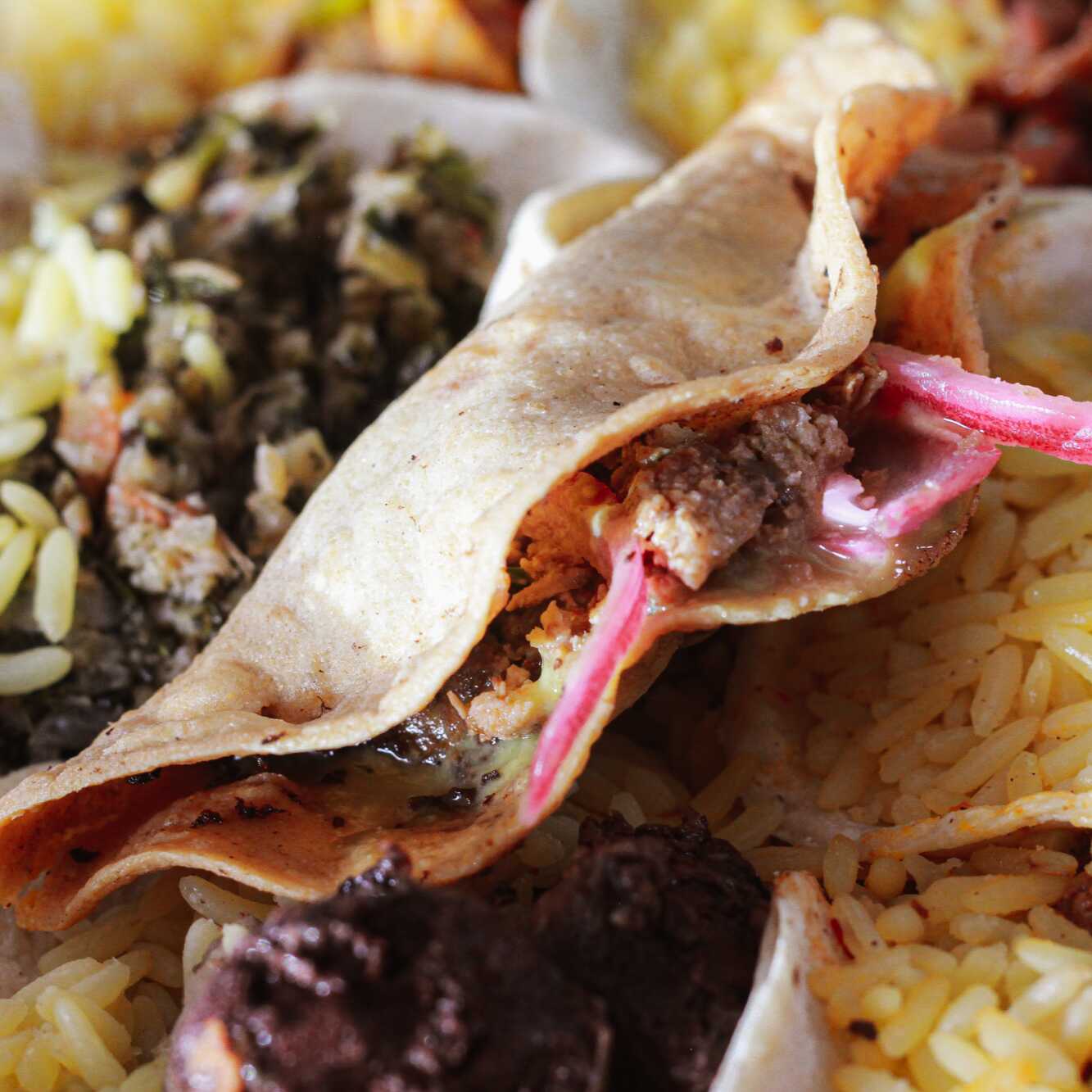 Taco de Guisado (Con arroz,verde, roja y cebolla)*5 + Agua Fresca*1