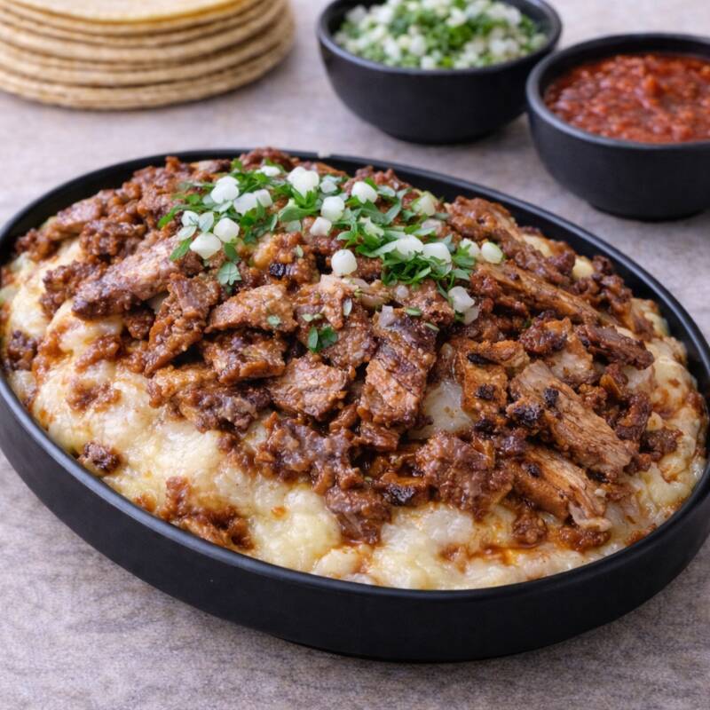 Nuestro clásico kilo de pastor con queso derretido. Incluye tortillas, limones y salsa roja y verde. *La carne se pesa precocida.