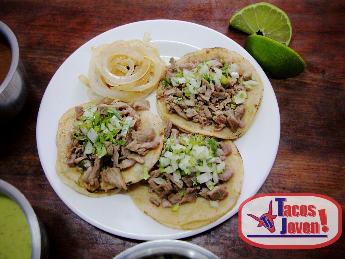 Taco de tortilla de maíz, relleno de carne asada combinado con cuerito de cerdo; acompañado de cebolla con cilantro.