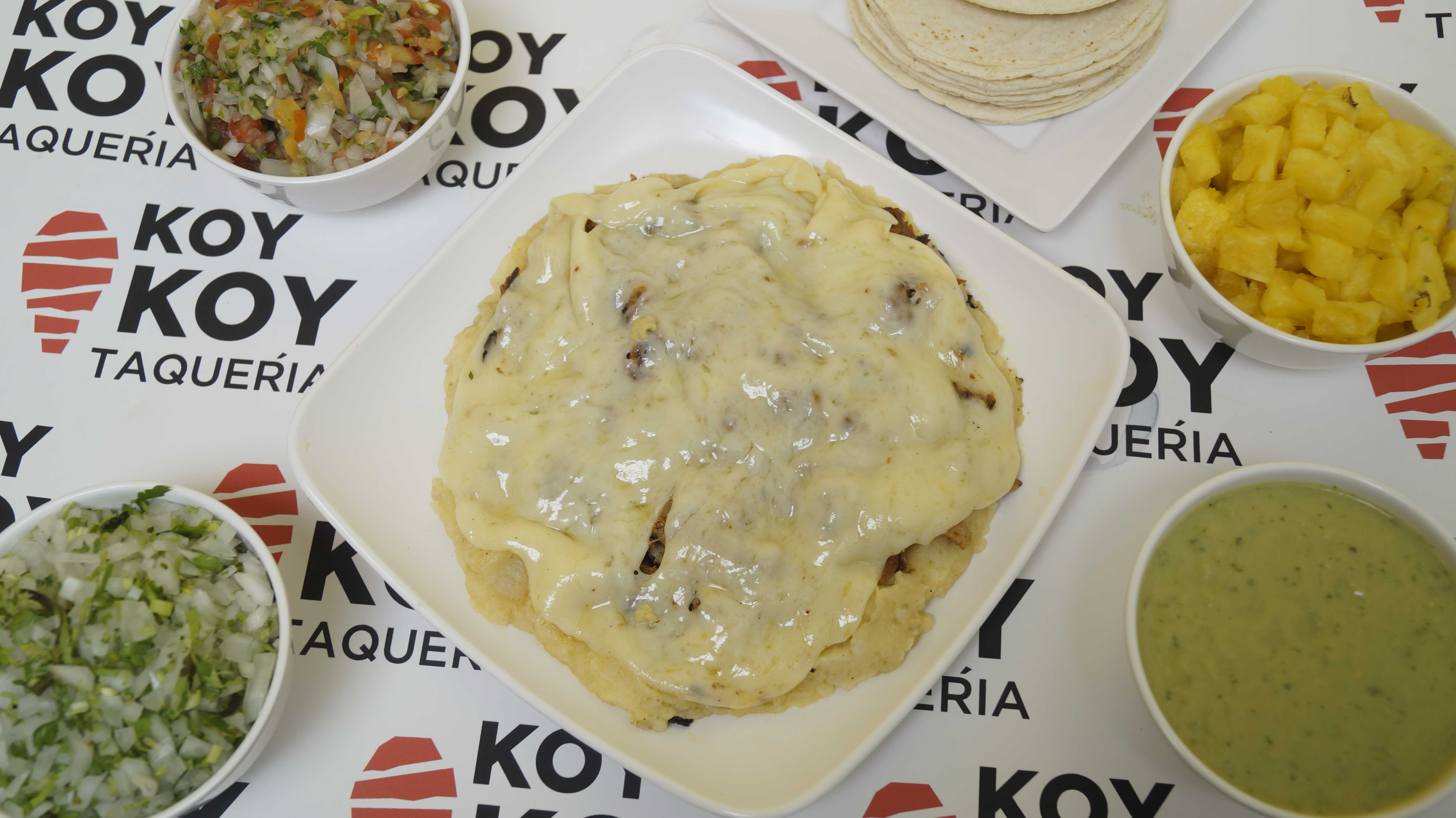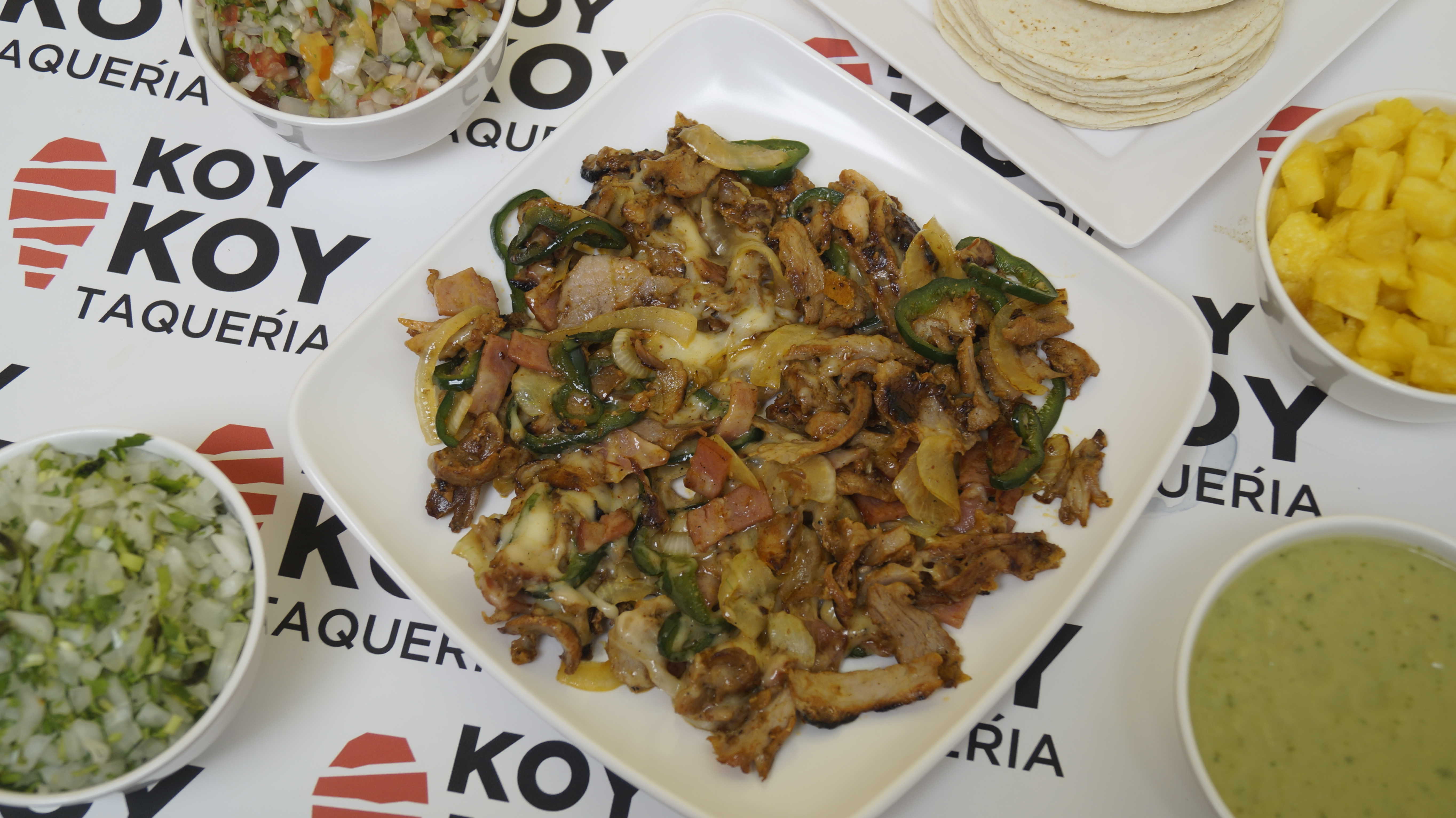 Combinación de carne de pastor, sirloin, longaniza, tocino y queso gouda fundido (300 gr) . Acompañado de tortillas