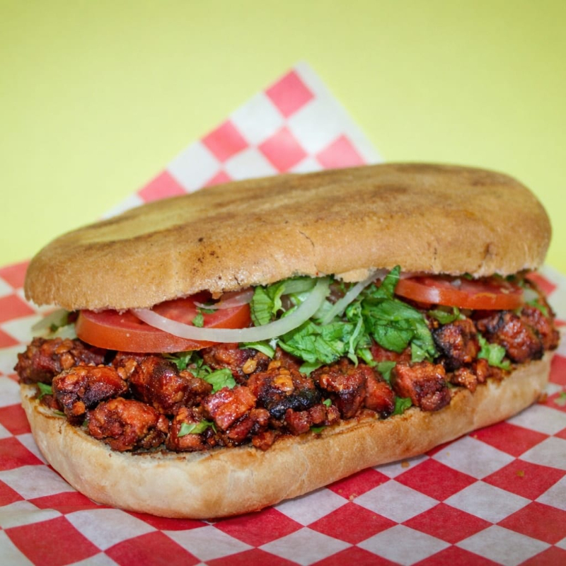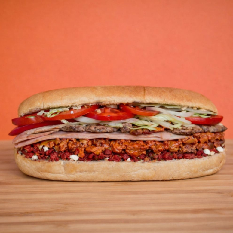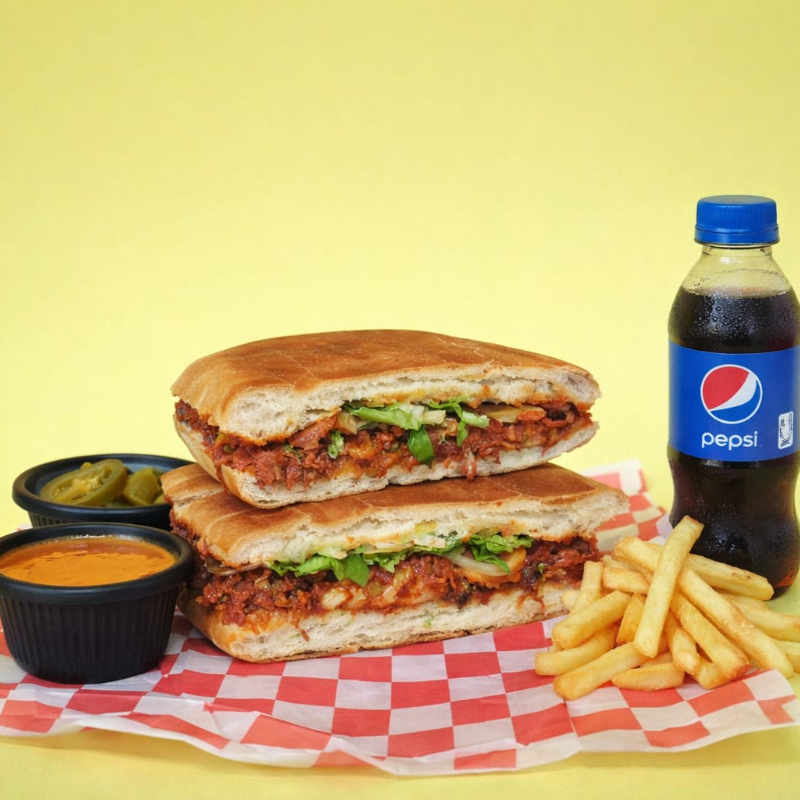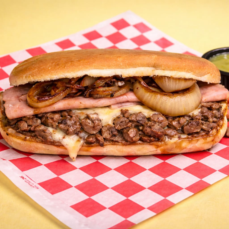 (Bistec de res, queso gouda, jamón y cebolla asada)