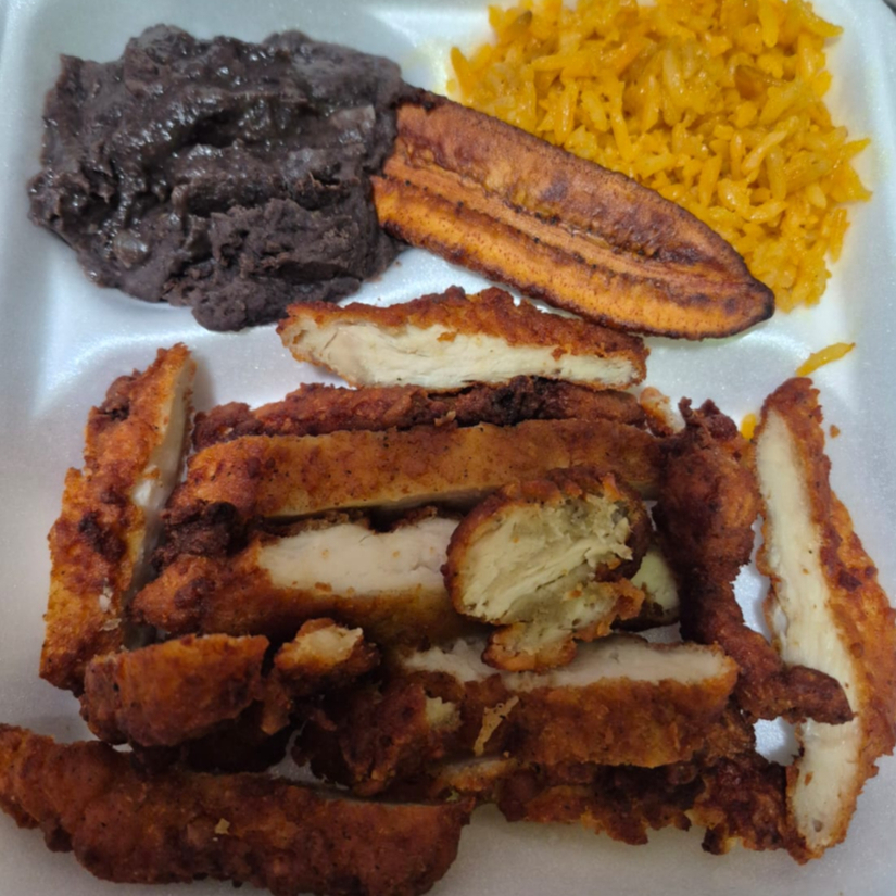 Pechuga empanizada acompañada de frijol, arroz y platanito.