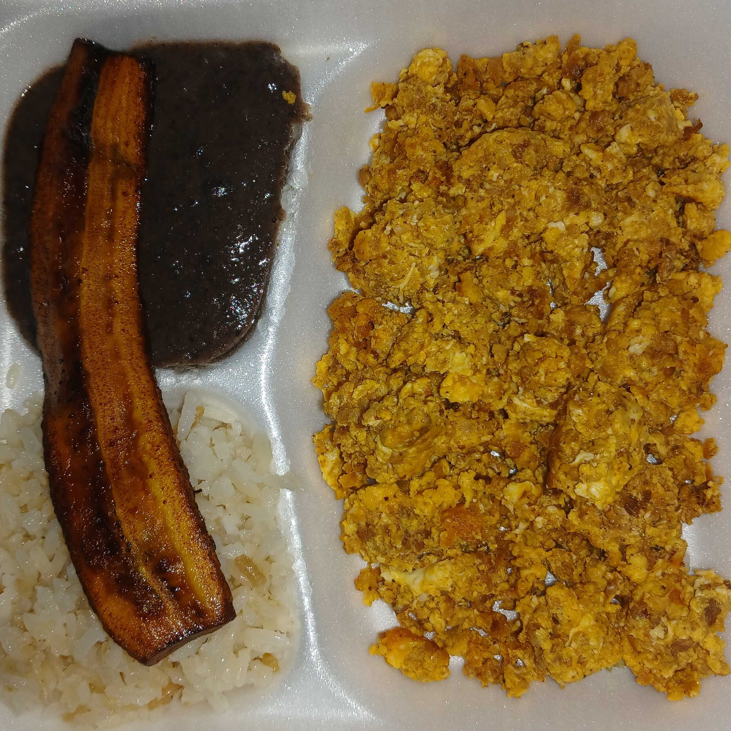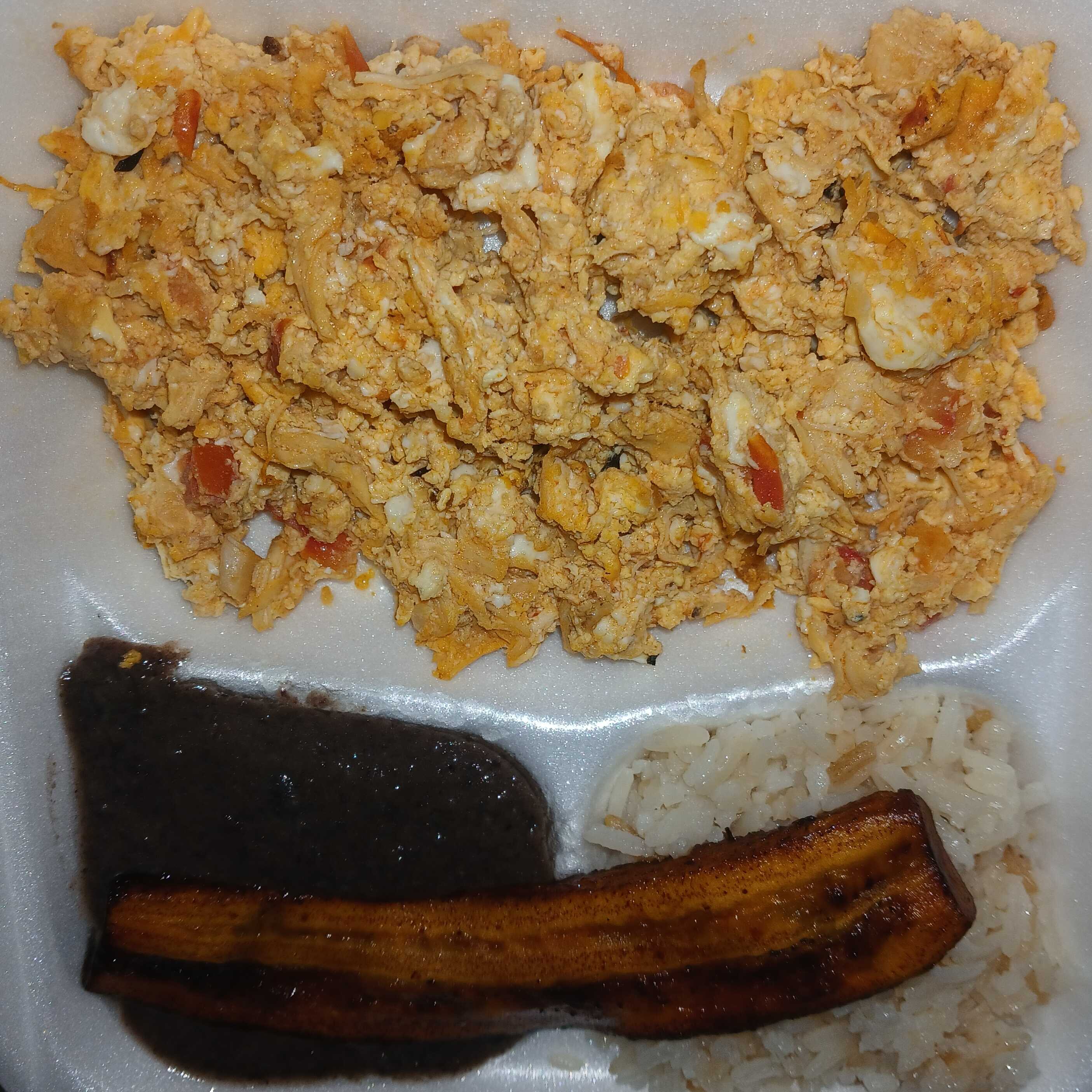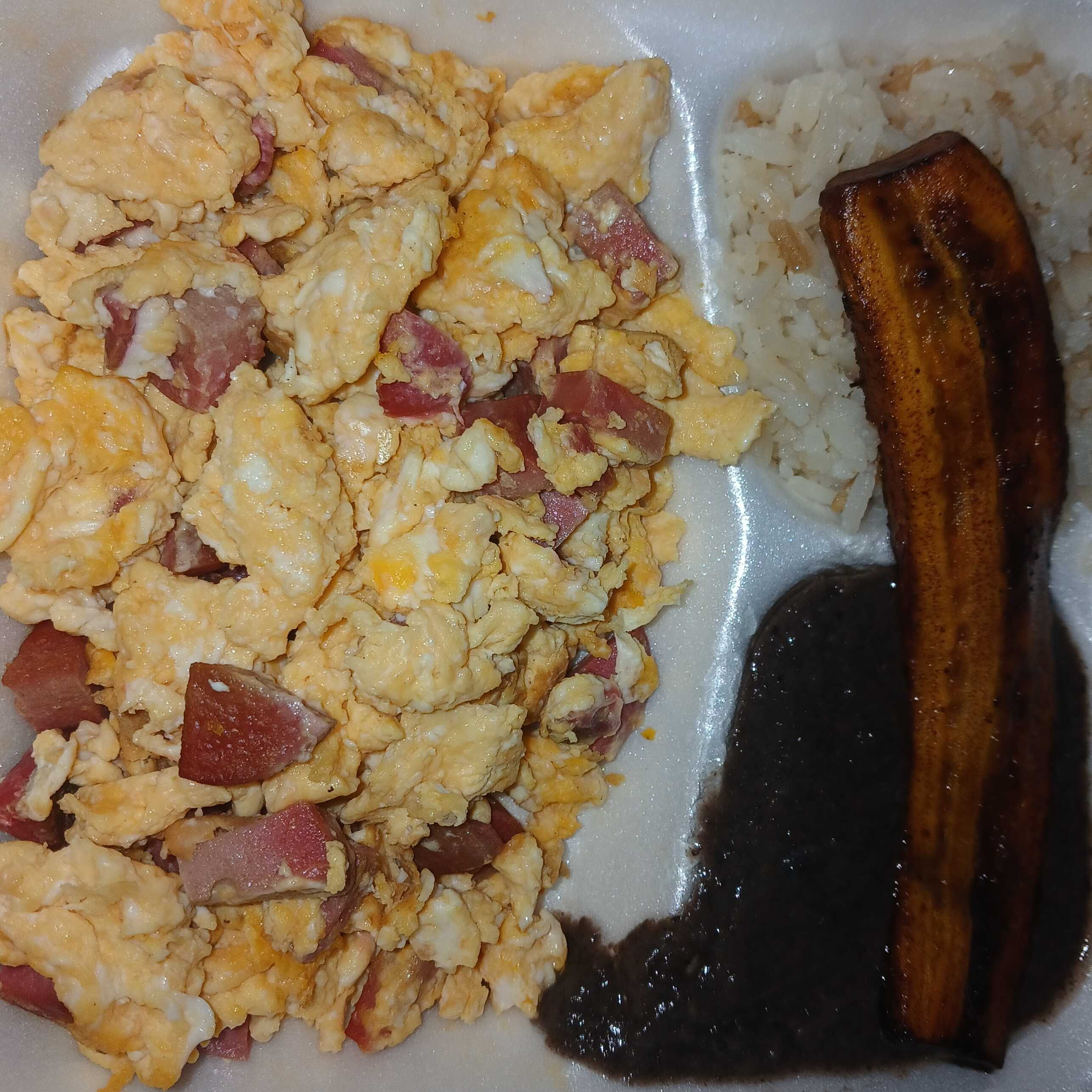 Huevito con jamon acompañado de arroz, frijolitos y platanito.