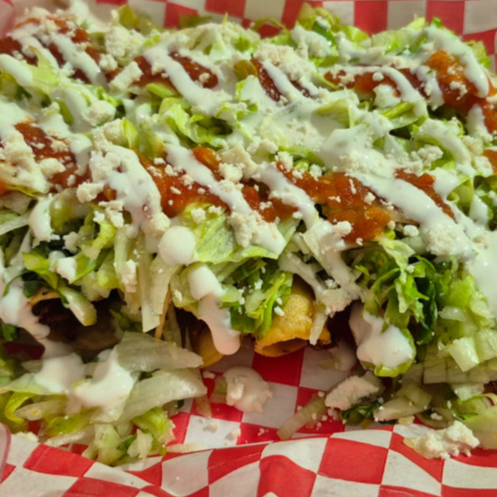 6 pzs de taquitos dorados de pollo acompañados con lechuga, media crema, queso crema y salsa.