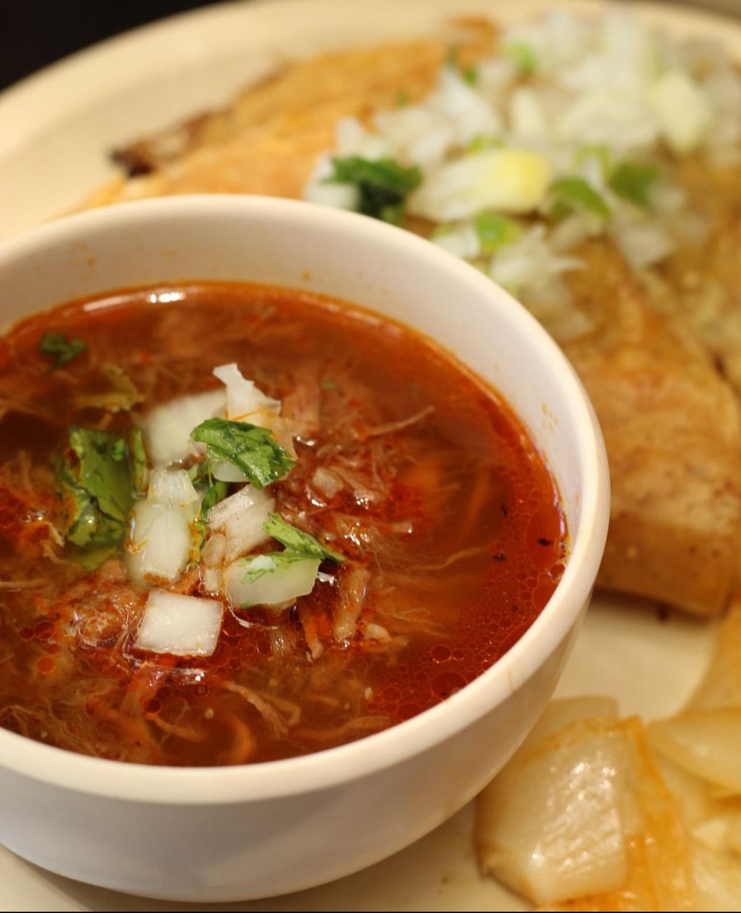Caldo de 6 onzas (consomé de barbacoa sin carne), acompañado de salsas.