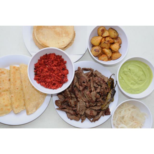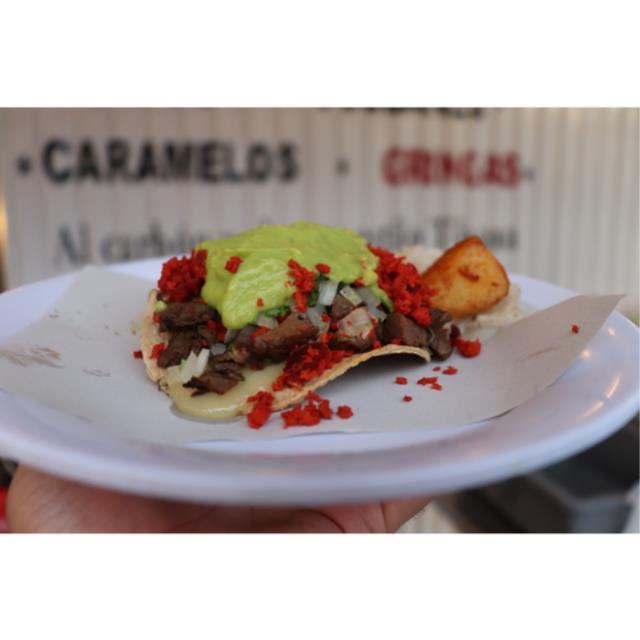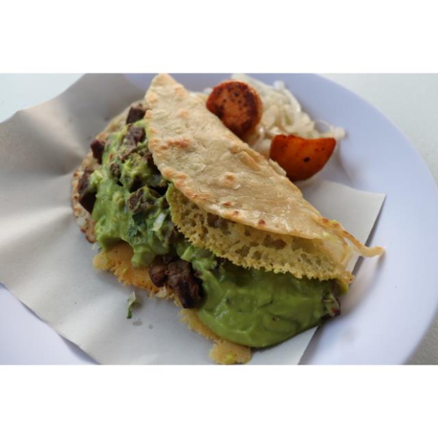 Tortilla de harina artesanal con queso hecho costra, arrachera con longaniza al carbón, guacamole y cebolla con cilantro.