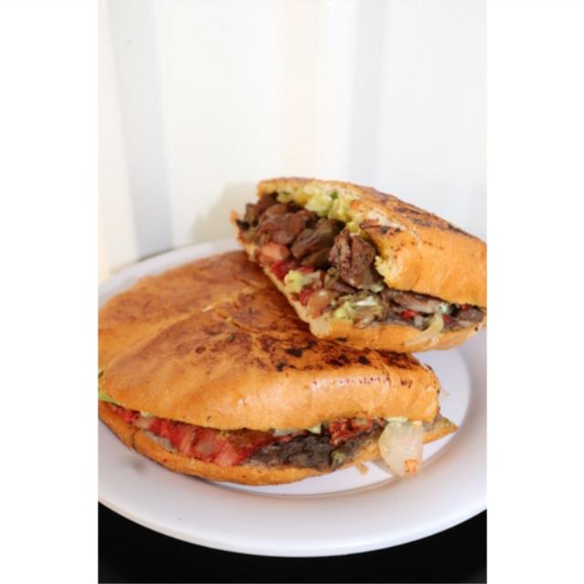 Pan telera jumbo con arrachera y longaniza al carbón, guacamole, mayonesa, frijol, cebolla con cilantro y cebollita asada.