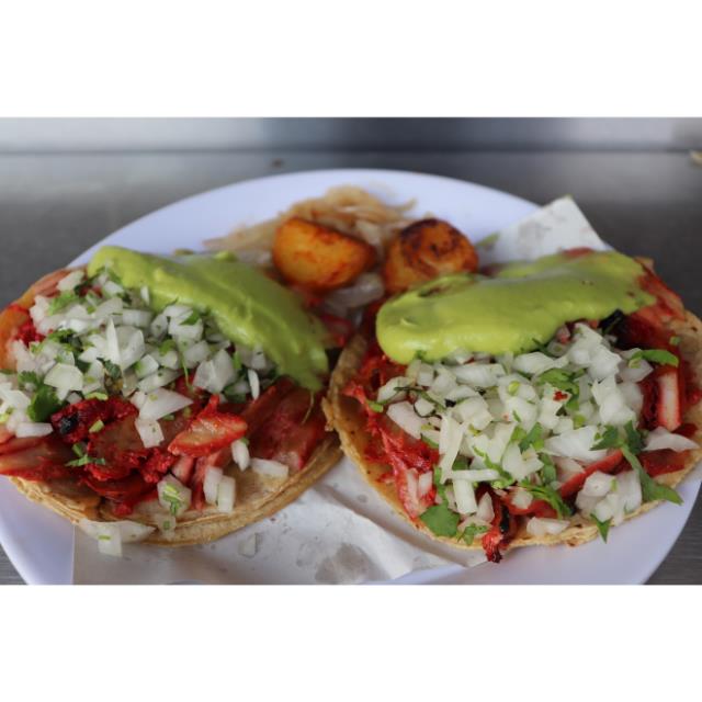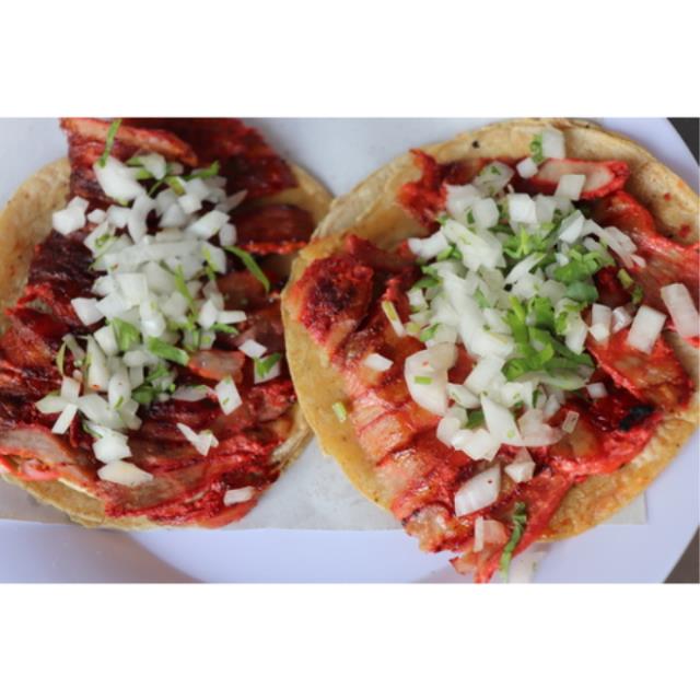 Tortilla de maíz con trompo de pastor y cebolla con cilantro. Nota: No incluye guacamole ni cortesía de cebollita asada y papita cambray.